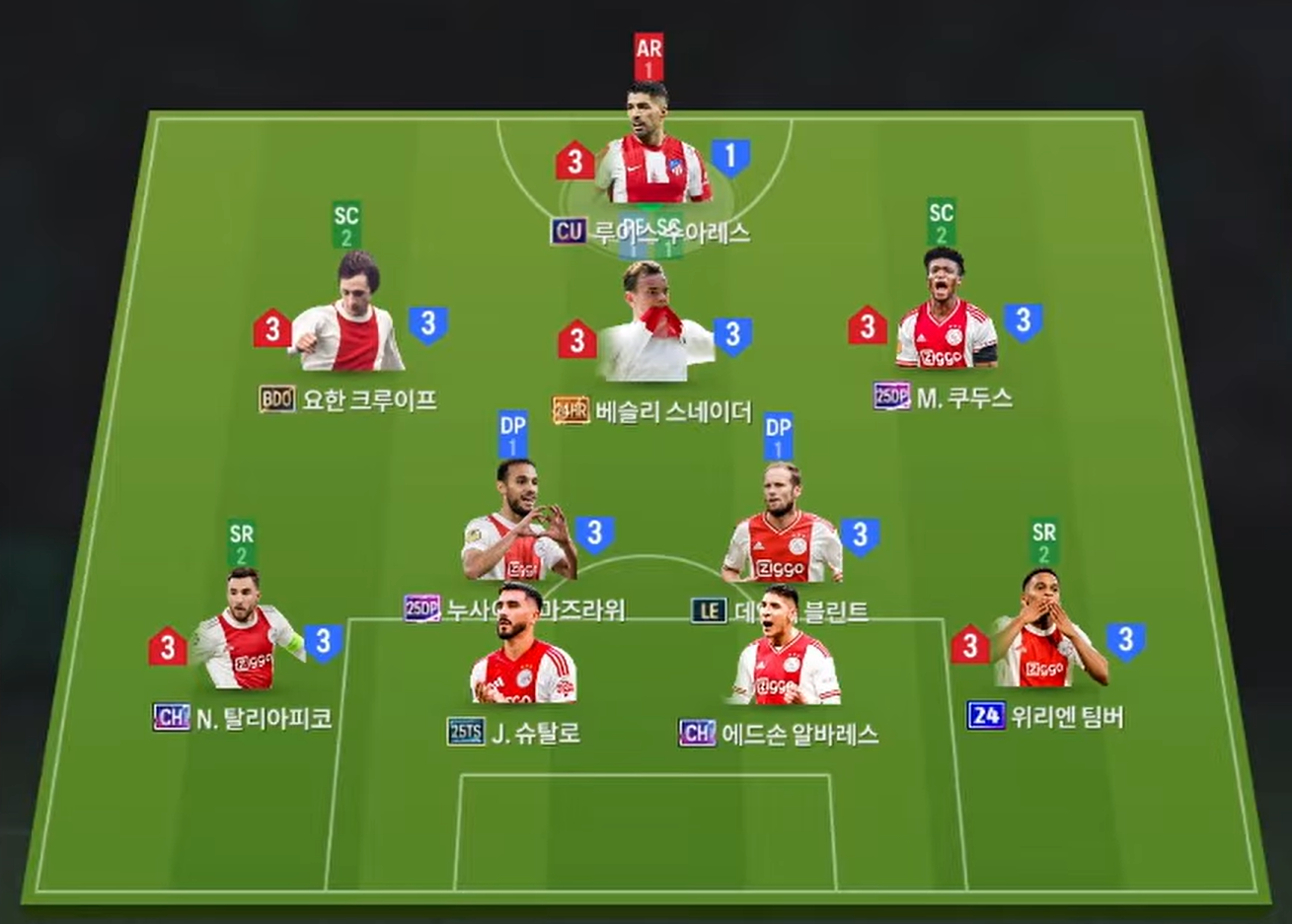 Sơ đồ được lựa chọn là sơ đồ 4231 với vị trí tiền đạo cắm là Suarez, cầu thủ người Uruguay sở hữu khả năng dứt điểm cực kì nhạy bén và hiệu quả., AI di chuyển khôn cùng khả năng chuyền bóng tốt. Bộ 3 tiền vệ tấn công Cruyff, Sneijder và Kudus lần lượt cho 3 vị trí LAM, CAM và RAM trong đó Cruyff và Kudus sẽ có xu hướng chơi bám biên nhiều hơn trong khi vị trí tiền vệ trung tâm Sneijder cũng đem lại hiệu quả từ những pha dứt điểm tuyến 2.