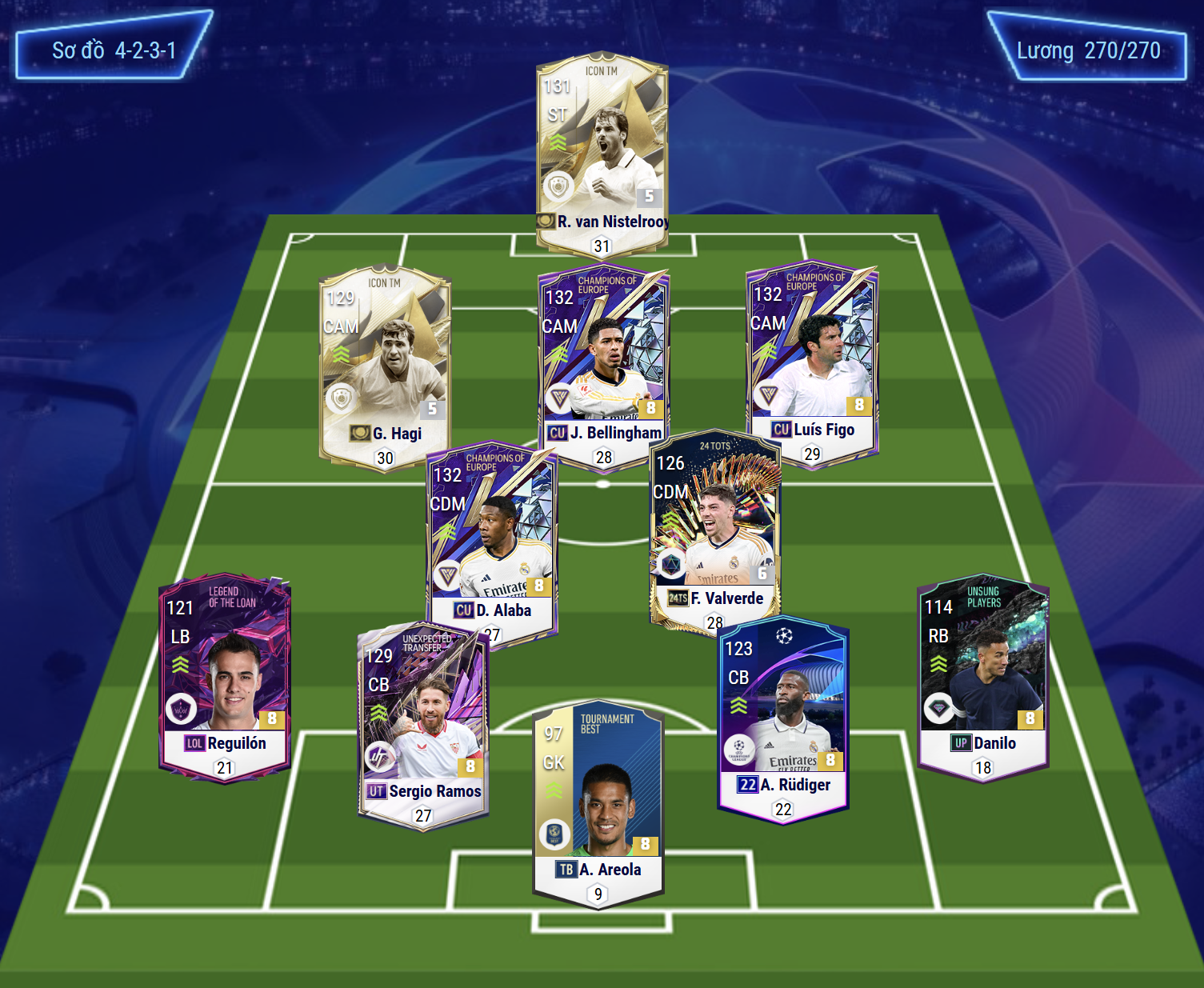 Sơ đồ 4231 với vị trí tiền đạo cắm được lựa chọn là Van Nistelrooy. Bộ 3 tiền vệ công LAM, CAM và RAM lần lượt là Hagi, Bellingham và Figo. Đây được xem là 3 cái tên tiềm năng khi có thể thi đấu đa năng và hoán đổi vị trí cho nhau cực kì tốt.