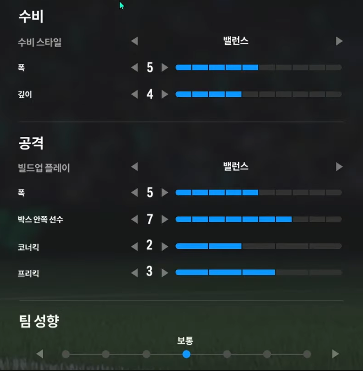 Trong khi, thiết lập tấn công "cân bằng" sẽ phù hợp cho lối chơi kiểm soát bóng, triển khai thế trận chậm, chắc ở tuyến giữa và ban bật với các vệ tinh trên hàng công để mở ra khoảng trống và ghi bàn. Ở lối chơi tấn công này, xu hướng triển khai sẽ là xu hướng chậm, chắc bóng và tìm kiếm cơ hội thay vì tấn công tổng lực và tốc độ cao.