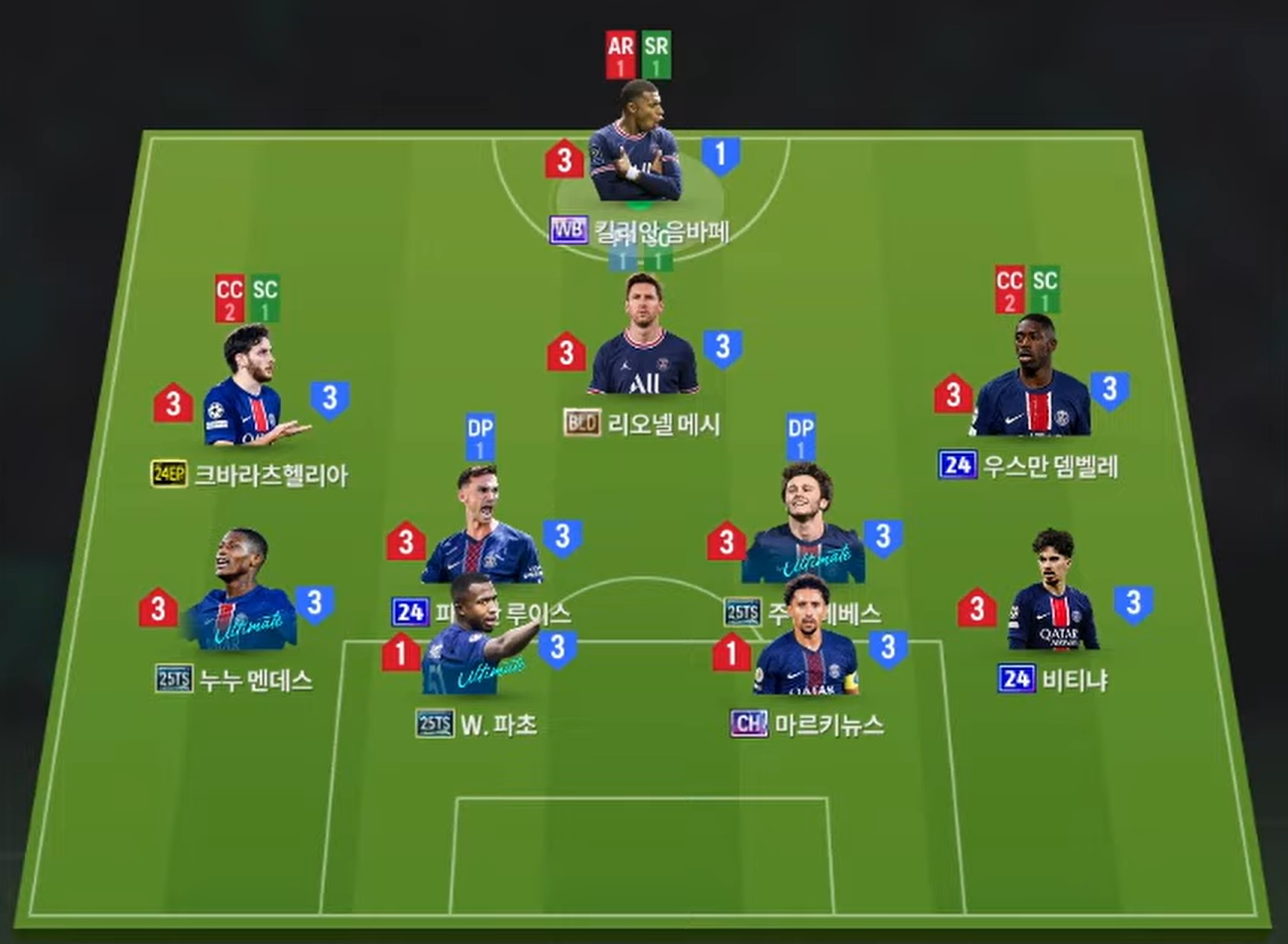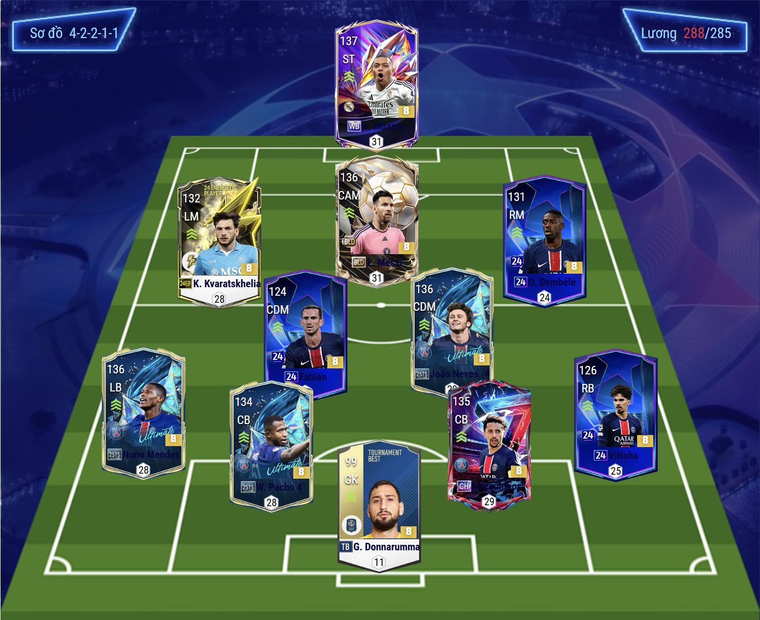 Sơ đồ 42211 được lựa chọn với vị trí tiền đạo cắm là Mbappe, cầu thủ người Pháp là một trong những tiền đạo toàn diện với khả năng dứt điểm đa dạng, AI di chuyển thông minh cùng tốc độ nhanh sẽ tạo ra cực kì nhiều đột biến trong các tình huống dâng cao. Hỗ trợ phía sau là Messi, một trong những tiền vệ cực kì đa năng sở hữu khả năng rê dắt nổi bật, kỹ năng chuyền bóng cho tới sút xa hiệu quả. Cặp cánh Kvaratskhelia và Dembele đều là những cái tên chất lượng, kỹ năng chuyền tạt tốt, tốc độ nhanh và khả năng rê dắt và xâm nhập hiệu quả.