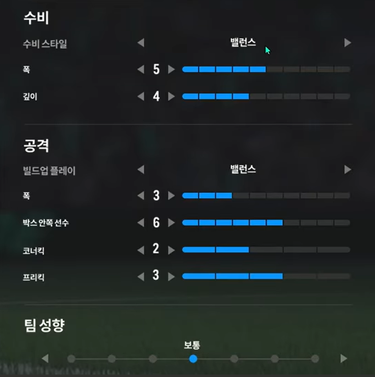 Trong khi, thiết lập tấn công "cân bằng" sẽ phù hợp cho lối chơi kiểm soát bóng, triển khai thế trận chậm, chắc ở tuyến giữa và ban bật với các vệ tinh trên hàng công để mở ra khoảng trống và ghi bàn. Ở lối chơi tấn công này, xu hướng triển khai sẽ là xu hướng chậm, chắc bóng và tìm kiếm cơ hội thay vì tấn công tổng lực và tốc độ cao.