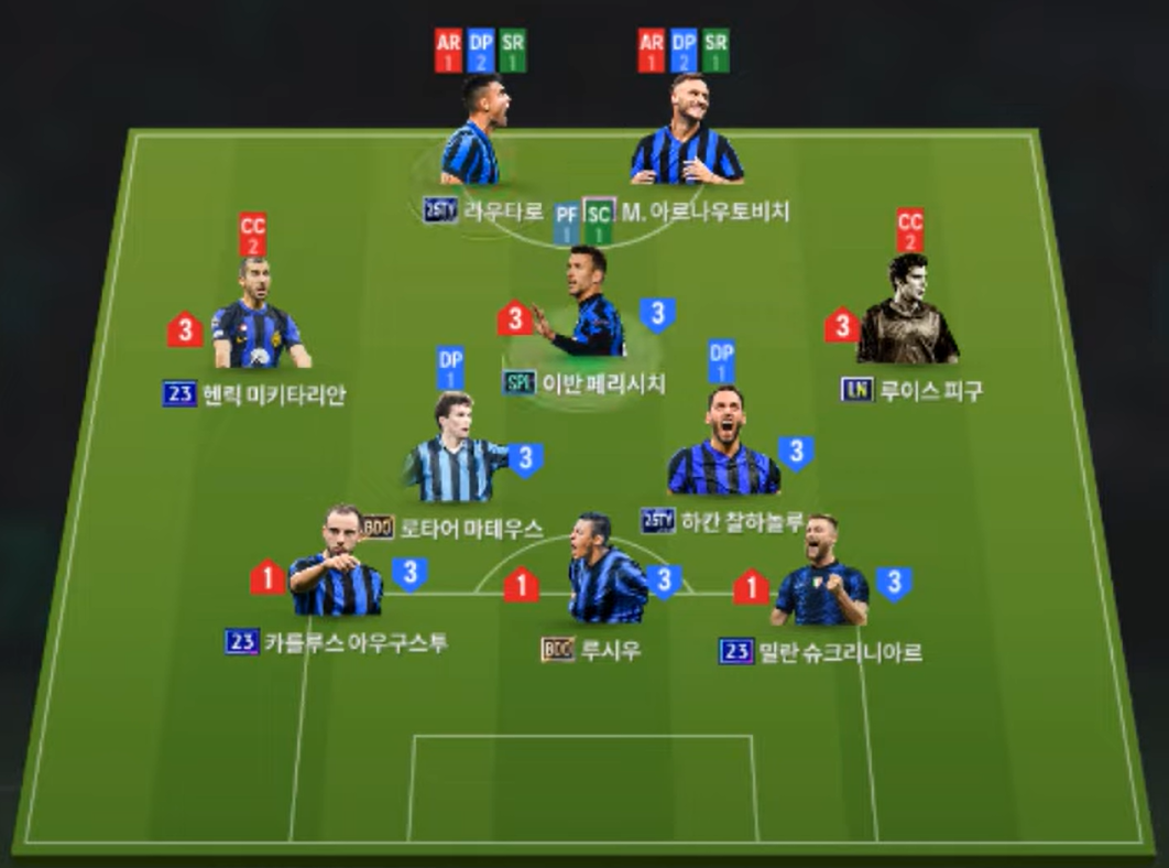 Sơ đồ 32212 được lựa chọn với cặp tiền đạo cắm Lautaro Martinez và Arnautovic, với 1 cầu thủ có AI chạy chỗ tốt kết hợp với 1 cầu thủ có khả năng làm tường và không chiến hiệu quả. Tiền vệ công Perisic sở hữu lối chơi đa năng từ chuyền sút cho đến rê dắt bóng sẽ giúp tuyến giữa linh hoạt hơn rất nhiều. Cặp tiền vệ cánh với Mkhitaryan và Figo sẽ đảm bảo khả năng chuyền tạt ấn tượng cũng như build up từ cánh đa dạng.