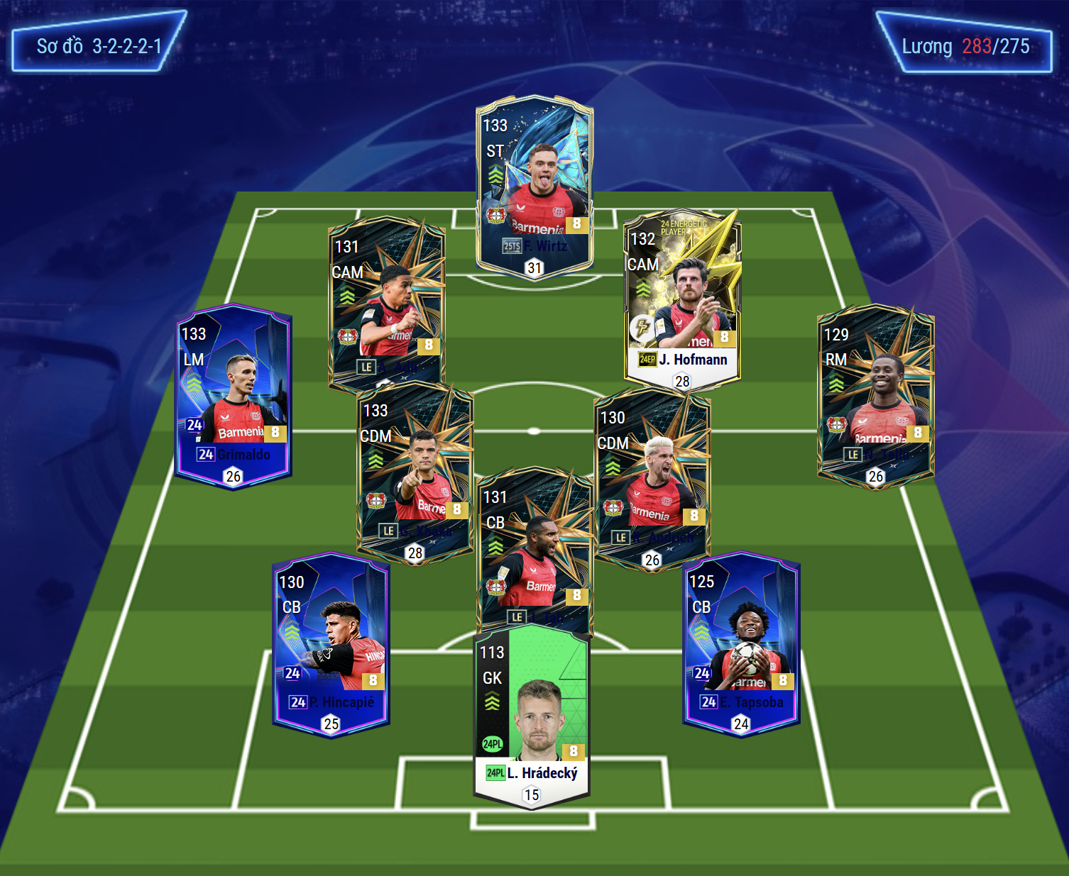 Sơ đồ 32221 được lựa chọn là biến thể của dạng sơ đồ 3421 với vị trí tiền đạo cắm là Wirtz, một trong những cái tên thi đấu cực kì đa năng trên hàng công và rất hợp meta 11. Cặp tiền vệ công được lựa chọn là Adli và Hofmann, cả 2 vừa có tốc độ ở mức ổn, vừa có khả năng chuyền bóng và dứt điểm tốt để đa dạng hóa các mũi tấn công trong đội hình.