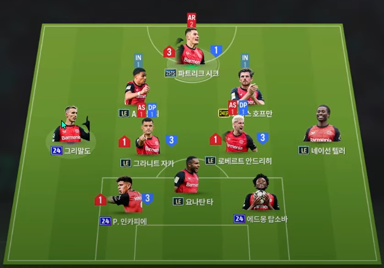 Cặp tiền vệ cánh lần lượt là Grimaldo và Tella, 2 cầu thủ này khá đa năng khi vừa có khả năng leo biên tốt vừa đảm bảo được khả năng hỗ trợ phòng ngự biên khi cần. Tiền vệ phòng ngự Xhaka và Andrich là những cái tên uy tin khi sở hữu khả năng chuyền bóng ổn, sút xa tốt và hỗ trợ phòng ngự hiệu quả. Bộ 3 trung vệ với Hincapie, Tapsoba và Tah sẽ là lá chắn thép trước khung thành của Hradecky.