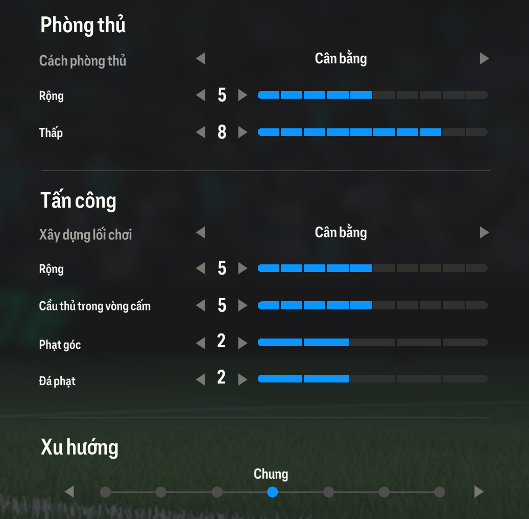 Lối chơi phòng ngự cân bằng được áp dụng với rộng 5 thấp 8 nhằm tạo một thế trận phòng ngự lùi thấp nhưng vẫn giữ đều các vị trí để kiểm soát không gian phòng ngự một cách tối ưu và biến tấu lối chơi phòng ngự tùy thuộc theo từng trận đấu