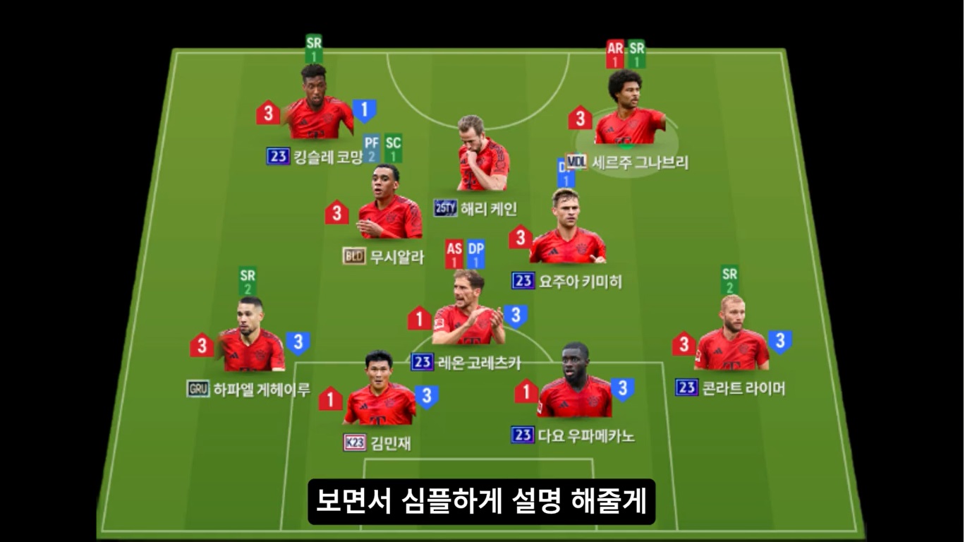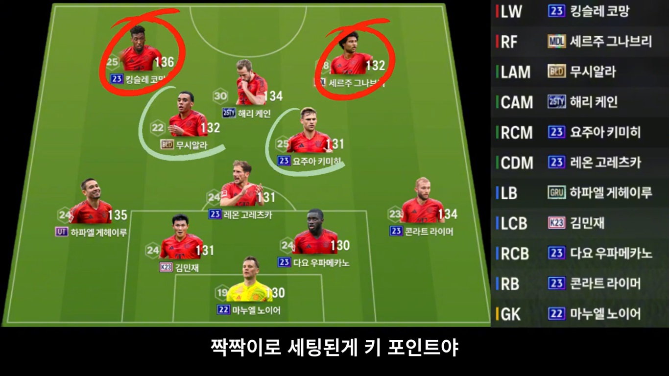 Sơ đồ 41122 với thiết lập biến tấu từ sơ đồ 4123 và có một vài thay đổi để phù hợp với nhân lực và meta. Vị trí LW được lựa chọn với cái tên Coman, ở bên cánh đối diện, vị trí RW được kéo xuống thành RF, hơi bó sát trung lộ hơn và cái tên được lựa chọn là Gnabry. Tiền vệ công CAM được lựa chọn là Harry Kane cũng được kéo xuống từ vị trí CF ở sơ đồ gốc 4123. Cặp tiền vệ trung tâm với Musiala và Kimmich trong đó Musiala được nâng lên LAM trong khi Kimmich giữ nguyên vị trí LCM như ban đầu.