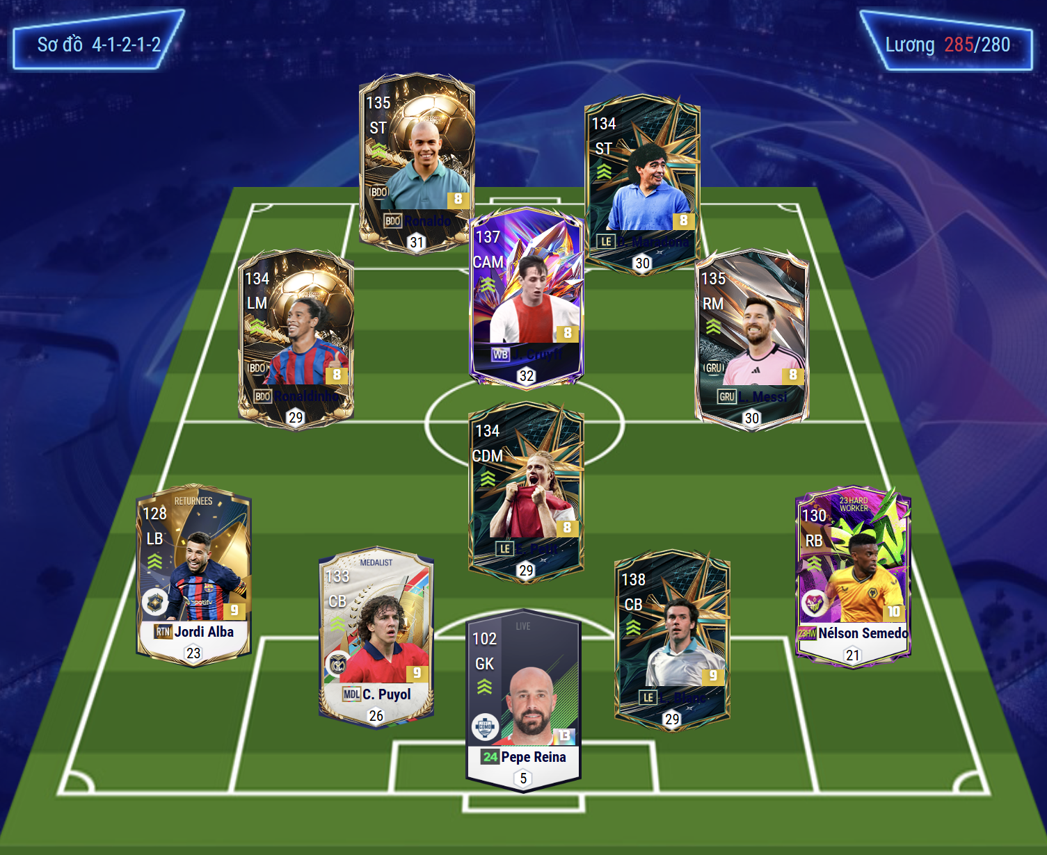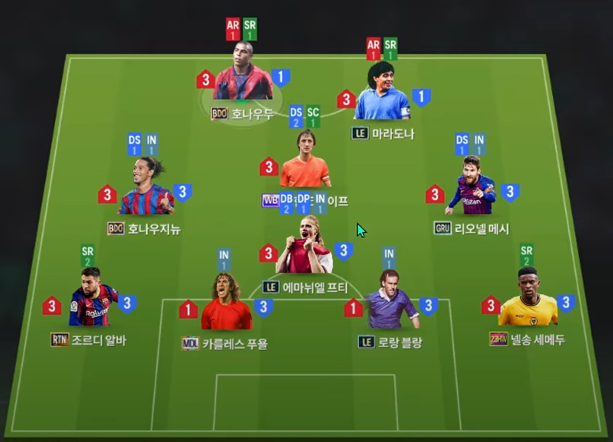 Sơ đồ được lựa chọn là 41212 với cặp tiền đạo Ronaldo de lima và Maradona. Cả 2 đều sở hữu tốc độ và khả năng sút bóng ấn tượng. Hỗ trợ phía sau là vị trí tiền vệ tấn công Johan Cruyff với khả năng chuyền bóng ấn tượng và sở hữu 2 chân 5-5 tạo nên hiệu quả tấn công ấn tượng. Cặp tiền vệ cánh Ronaldinho và Messi cũng là những cái tên có tốc độ lẫn khả năng xâm nhập dứt điểm rất tốt.