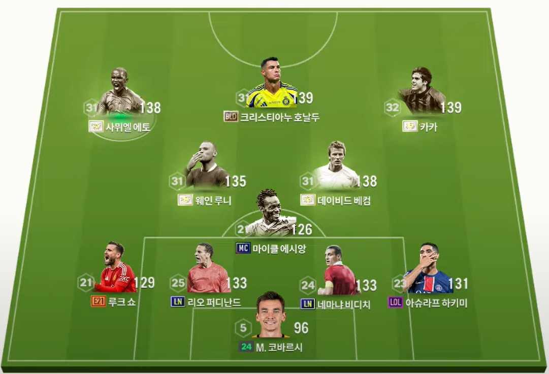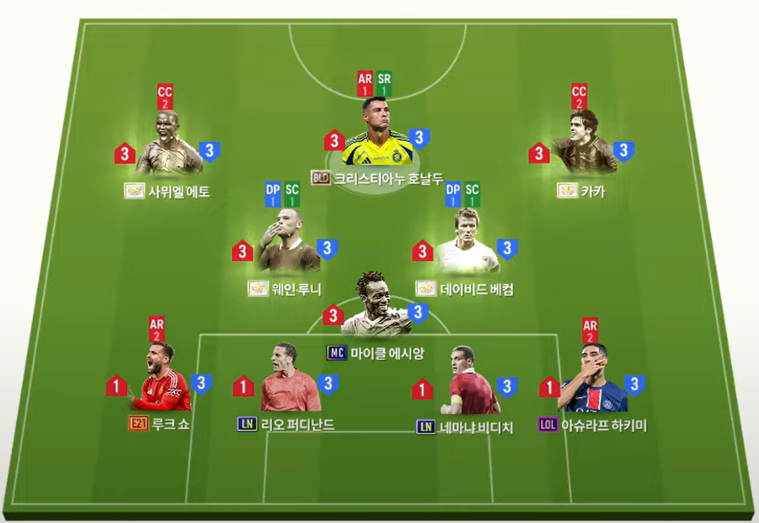 Sơ đồ 4123 với vị trí hộ công CF được lựa chọn là Cristiano Ronaldo, một trong những tiền đạo hàng đầu game hiện tại. Cặp tiền đạo cánh LW, RW lần lượt là Eto'o và Kaka, cả 2 đều sở hữu khả năng di chuyển xâm nhập vòng cấm tốt, tốc độ nhanh cũng như kỹ năng dứt điểm hiệu quả bằng 2 chân. Cặp tiền vệ trung tâm CM với Rooney và Beckham không chỉ đảm nhận vai trò chuyền bóng, sút tuyến 2 tốt mà kỹ năng hỗ trợ phòng ngự cũng là khá ổn.