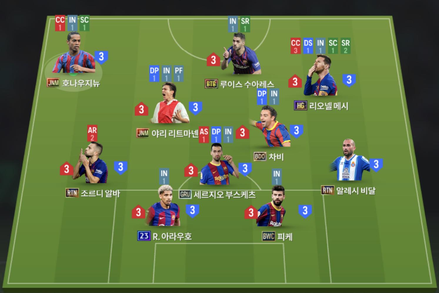 Sơ đồ 4123 với vị trí tiền đạo ở khu vực trung tâm là Suarez cho vai trò CF. Cặp tiền đạo cánh Ronaldinho và Messi được xem là những cái tên sở hữu tốc độ cũng như kỹ năng xử lý bóng cực kì dẻo. Cặp tiền vệ trung tâm Litmanen và Xavi đảm nhận vai trò cầm bóng và xử lý phối hợp ở khu vực giữa sân.