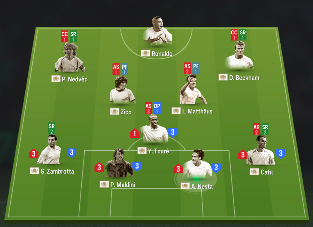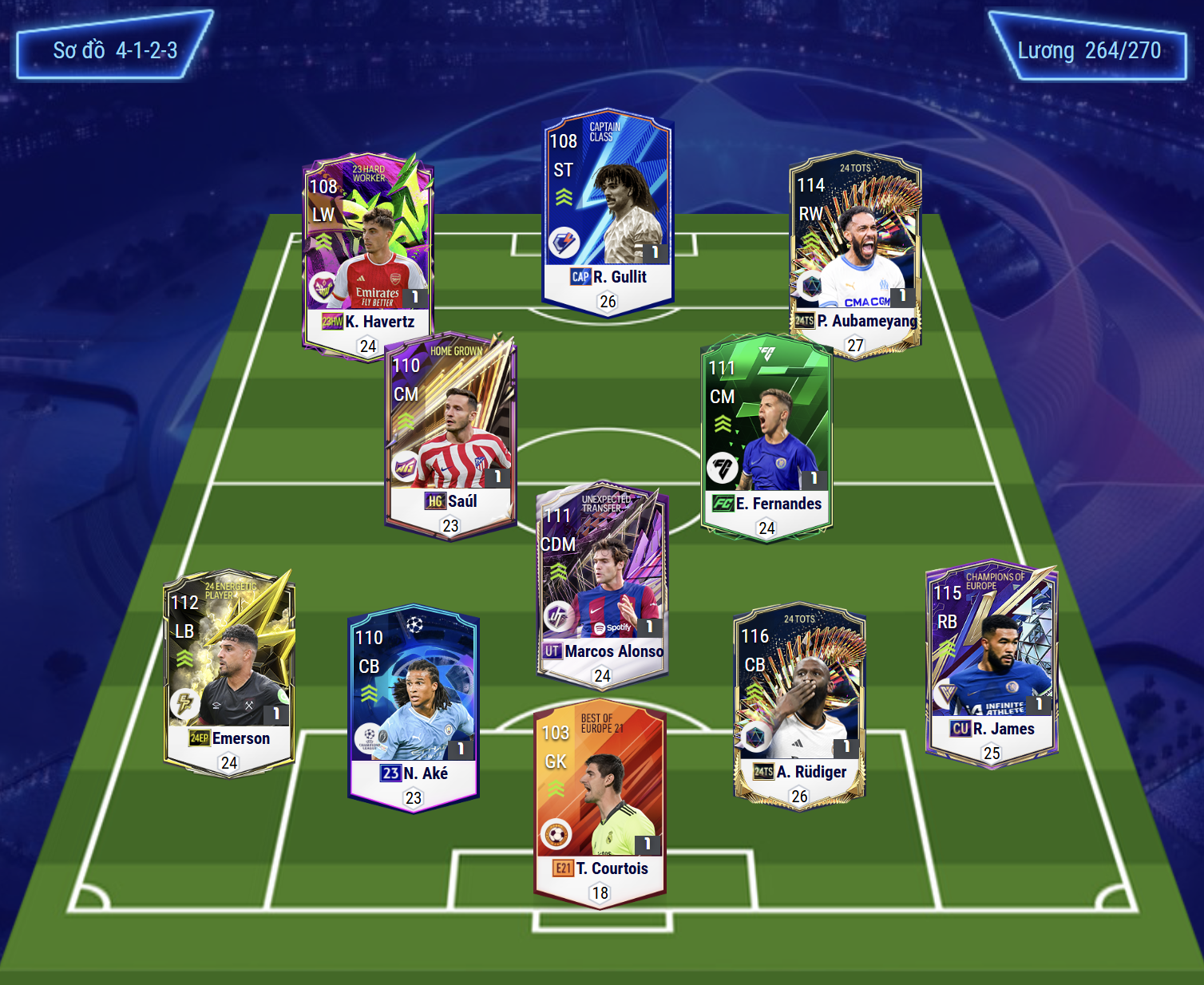 Sơ đồ 4123 với vị trí chơi cao nhất trên hàng công là Gullit ở vai trò tiền đạo cắm. Cặp đôi tiền đạo cánh được lựa chọn là Kai Havertz và Aubameyang, cả 2 đều có chiều cao lý tưởng và khả năng hỗ trợ tấn công lẫn không chiến đều tốt. Vị trí tiền vệ trung tâm với Saul và Enzo Fernandez là 2 cái tên thi đấu khá đa năng cả tấn công và phòng ngự