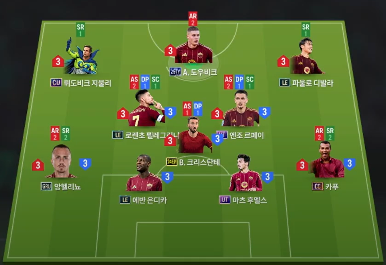 Sơ đồ được lựa chọn để tối ưu đội hình AS Roma là sơ đồ 4123, dạng sơ đò này khá phù hợp với đội hình đương đại của CLB. Vị trí tiền đạo cắm được tin dùng là Dovbyk với khả năng dứt điểm khá đa dạng và hiệu quả. Cặp tiền đạo cánh Giuly và Dybala sở hữu tốc độ tốt, khả năng xâm nhập hiệu quả cùng AI chuyền bóng lẫn sút bóng ấn tượng.