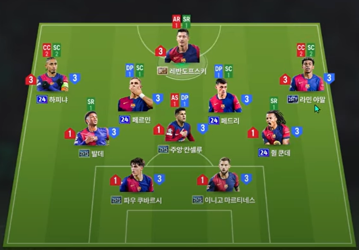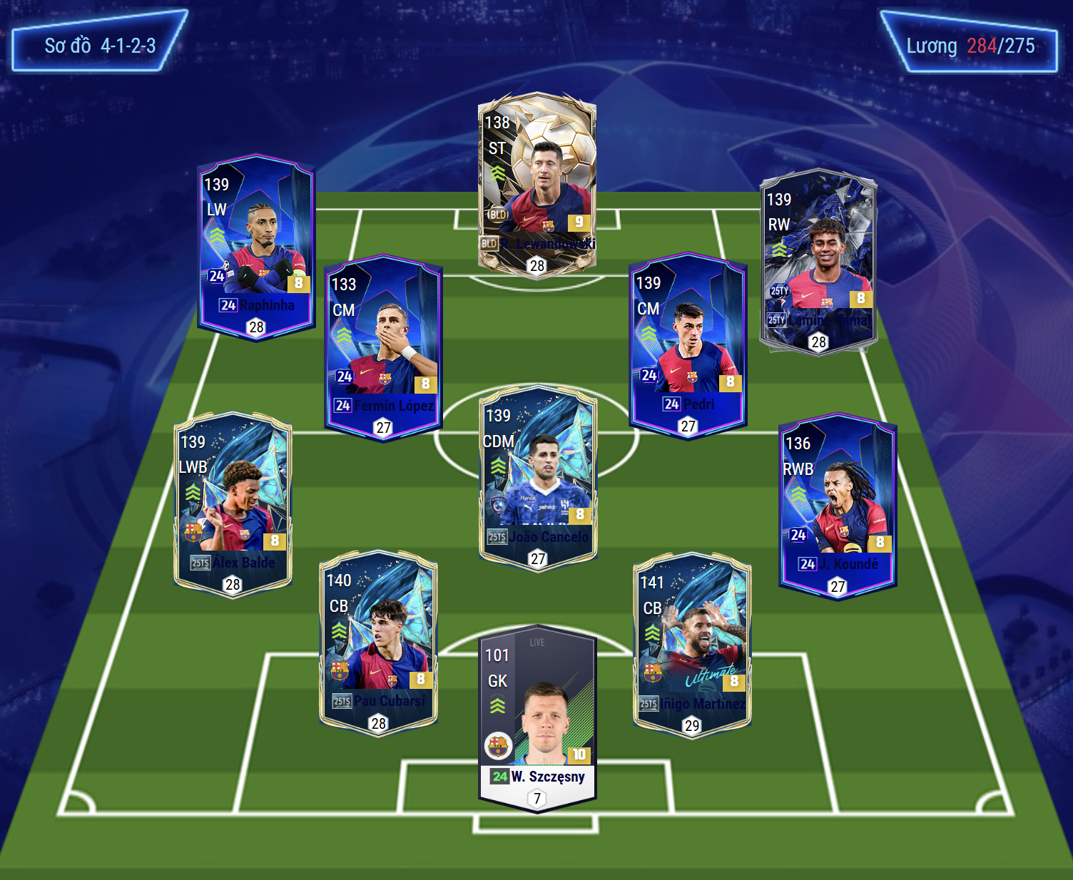 Sơ đồ 4123 được lựa chọn cho team color Barca đương đại với vị trí tiền đạo cắm chơi cao nhất trên hàng công là Lewandowski, đây được xem là tiền đạo toàn diện hàng đầu game lúc này. Cặp tiền đạo cánh LW, RW lần lượt là Raphinha và Yamal, cả 2 cầu thủ vừa sở hữu tốc độ lại vừa có khả năng chuyền tạt với sút bóng hiệu quả.