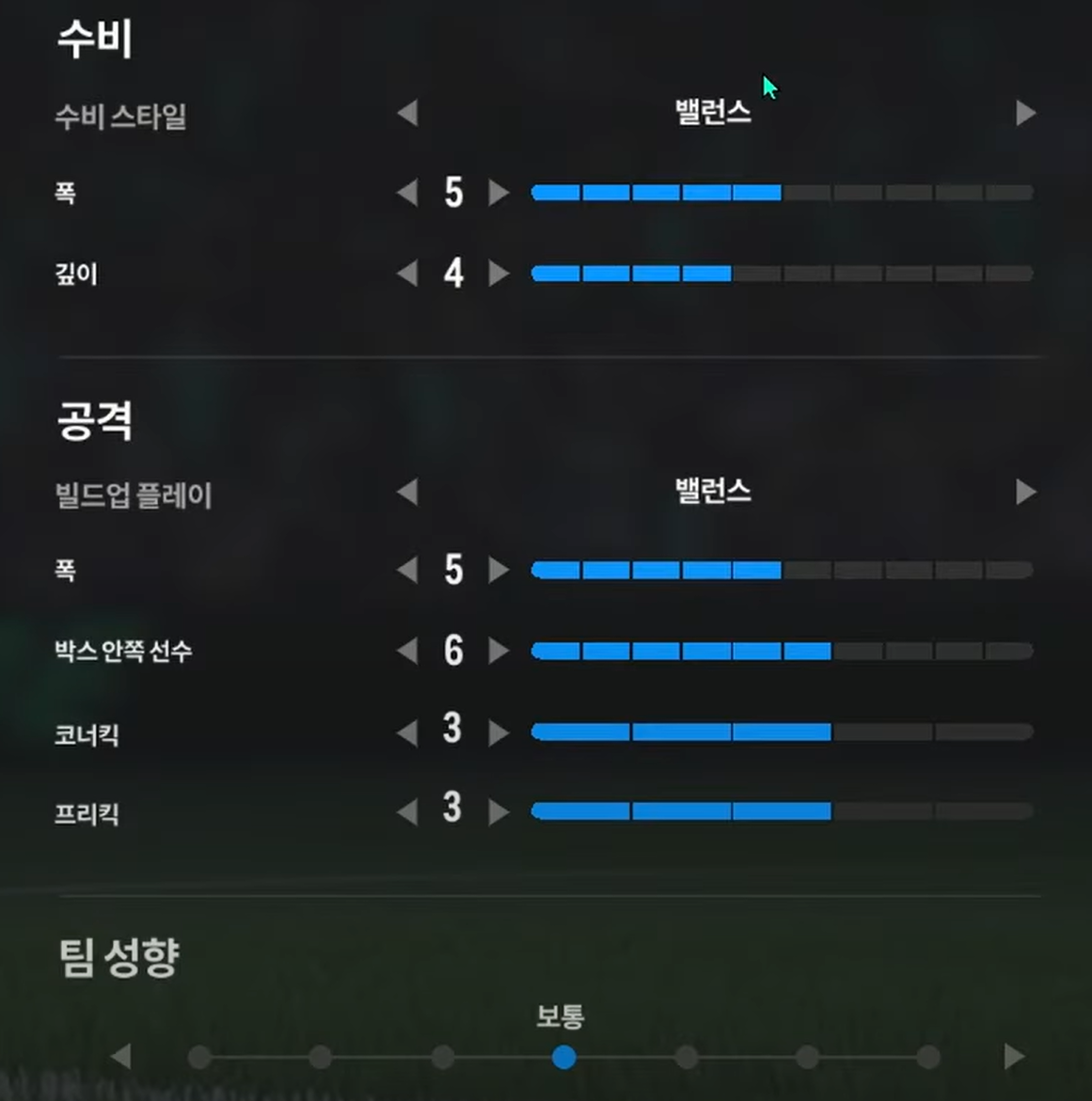 Trong khi, thiết lập tấn công "cân bằng" sẽ phù hợp cho lối chơi kiểm soát bóng, triển khai thế trận chậm, chắc ở tuyến giữa và ban bật với các vệ tinh trên hàng công để mở ra khoảng trống và ghi bàn. Ở lối chơi tấn công này, xu hướng triển khai sẽ là xu hướng chậm, chắc bóng và tìm kiếm cơ hội thay vì tấn công tổng lực và tốc độ cao.
