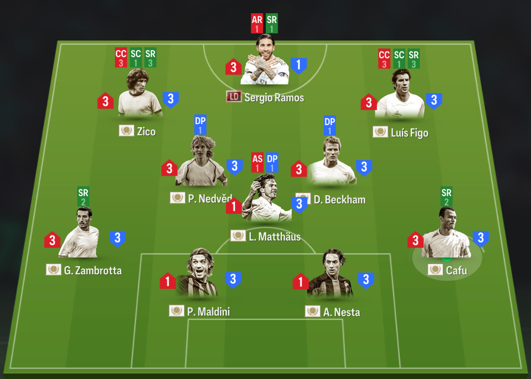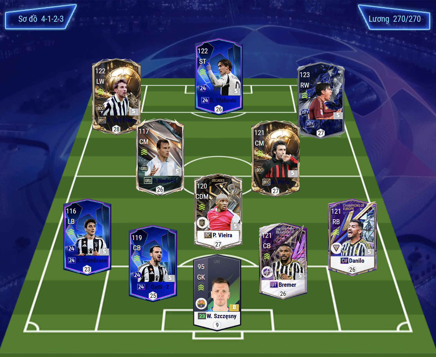 Sơ đồ 4123 với vị trí tiền đạo cắm được lựa chọn là Vlahovic, một trong những tiền đạo đương đại khá chất lượng. Cặp tiền đạo cánh Del Piero và Dybala là 2 cái tên được tin dùng với tốc độ ổn và khả năng rê dắt cực kì khéo léo. Tiền vệ trung tâm với Nedved và Pirlo sẽ là 2 nhân tố chất lượng cả về khả năng chuyền bóng, sút xa cho đến hỗ trợ phòng ngự.