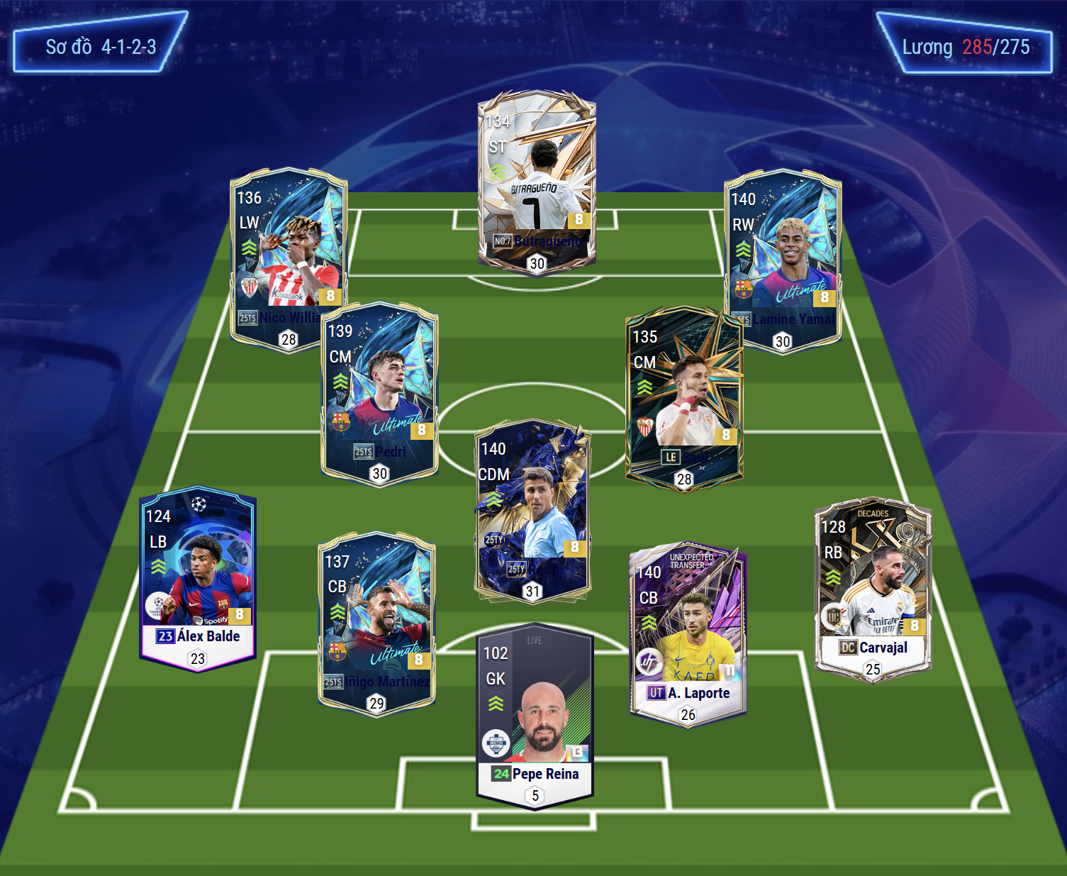 Bộ tứ vệ với Balde và Carvajal vừa tham gia leo biên tấn công vừa hỗ trợ phòng ngự hiệu quả. Tốc độ tốt, khả năng tắc bóng hay, AI dâng cao tạt bóng cũng khá ổn là điểm mạnh của bộ đôi này. Cặp trung vệ với Martinez và Laporte tạo nên sự chắc chắn ở khu trung tuyến bảo vệ tốt cho vị trí trước khung thành của Pepe Reina.