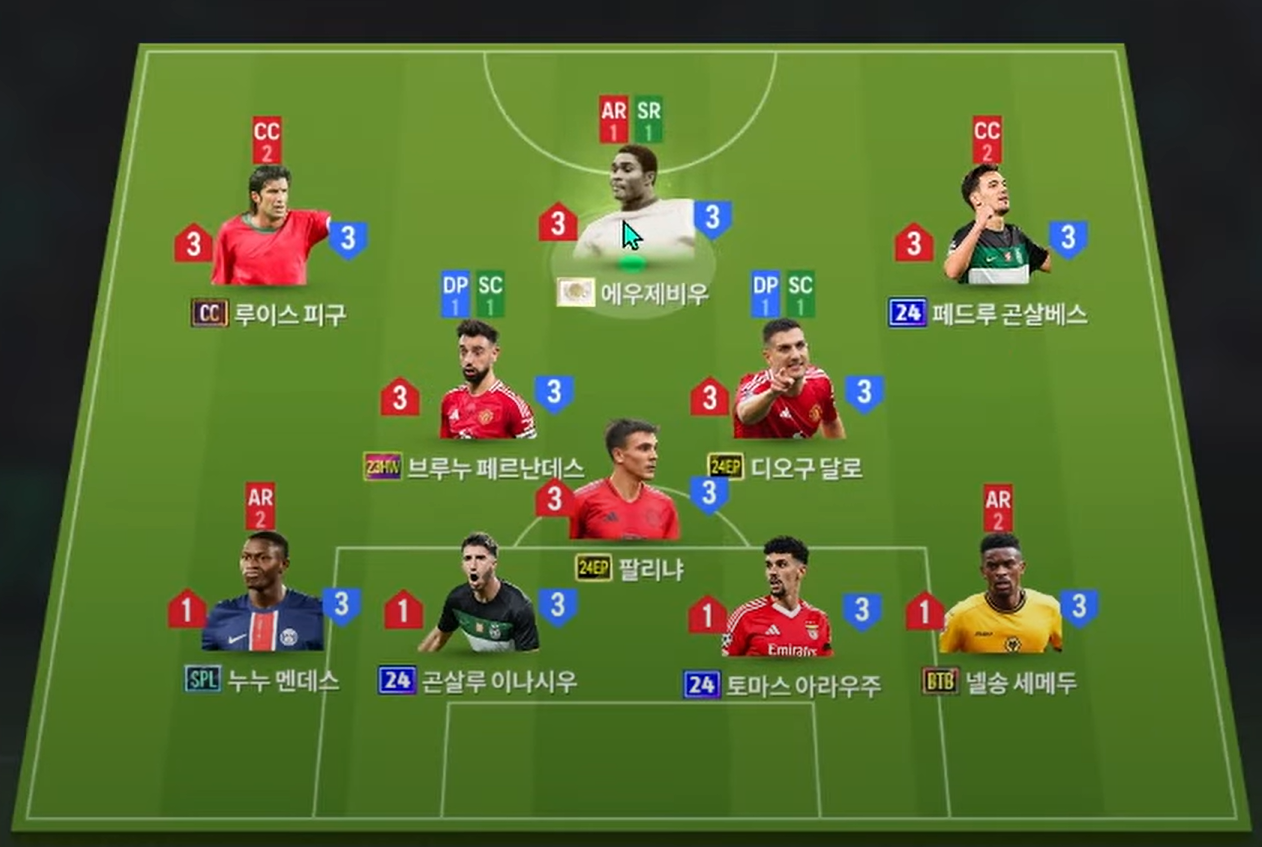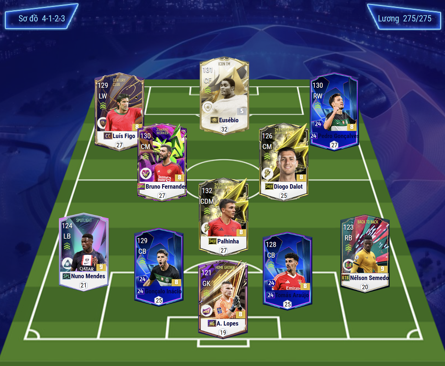 Sơ đồ 4123 với vị trí tiền đạo CF là cái tên chơi cao nhất trên hàng công. Ở vị trí này, Eusebio là cái tên được lựa chọn khi sở hữu tốc độ, khả năng dứt điểm tốt , tì đè tốt và AI cực kì không. Cặp tiền đạo cánh với Figo và Goncalves là 2 cái tên đảm bảo được hiệu suất tấn công biên ấn tượng.