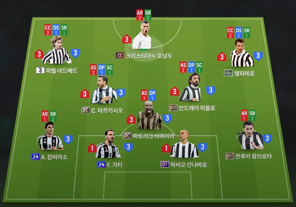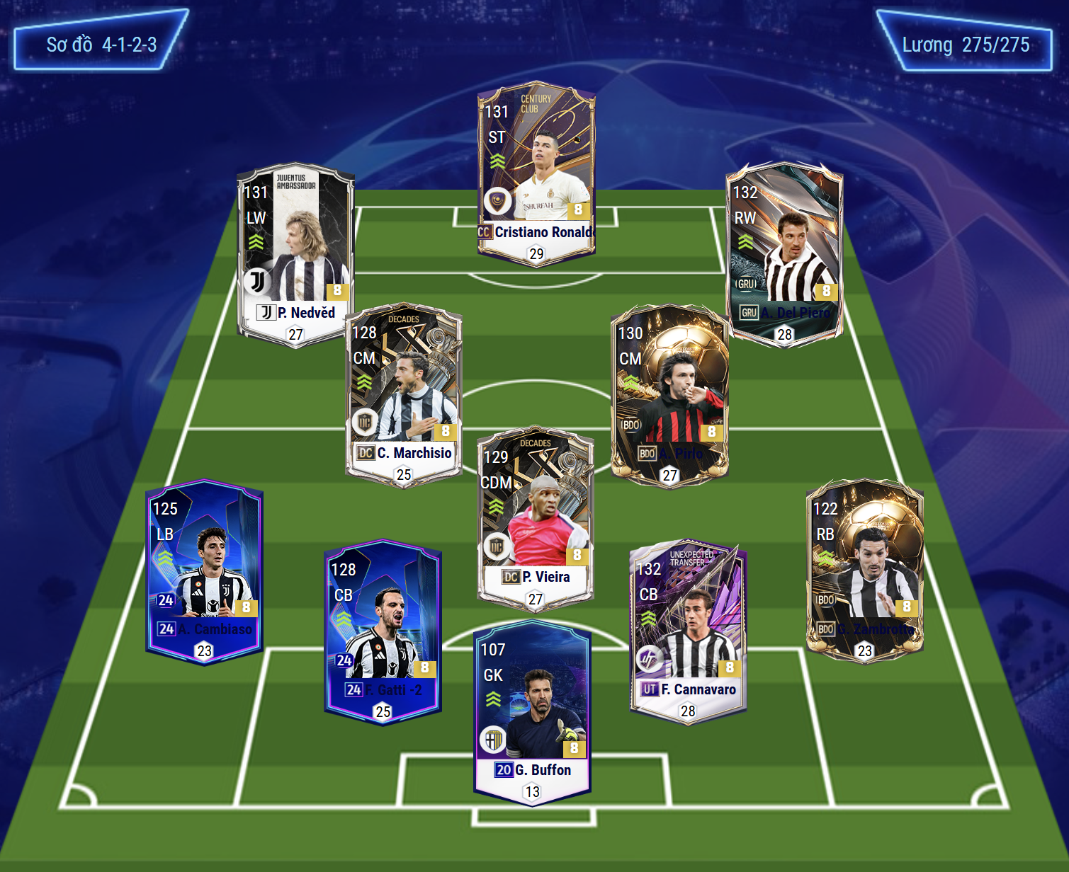Sơ đồ 4123 với vị trí cao nhất trên hàng công là tiền đạo cắm Cristiano Ronaldo. Đây được xem là tiền đạo toàn diện bậc nhất game hiện tại. Cặp đôi tiền đạo cánh lần lượt là Nedved và Del Piero, 2 cái tên quốc dân toàn diện cả về khả năng chuyền bóng lẫn sút xa.