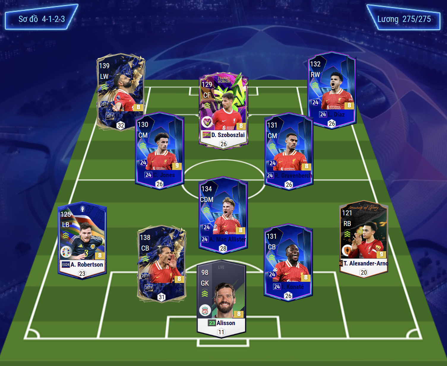 Sơ đồ 4123 được lựa chọn là dạng sơ đồ với vị trí tiền đạo sẽ là CF. Cầu thủ được lựa chọn là Szoboszlai với khả năng thi đấu khá toàn diện của mình. Cặp tiền đạo cánh LW và RW lần lượt là Salah và Diaz, cả 2 đều sở hữu tốc độ bùng nổ, khả năng di chuyển tham gia tấn công thông minh và hiệu quả từ 2 bên hành lang cánh.