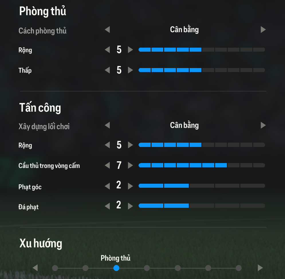 Lối chơi phòng ngự cân bằng được áp dụng với rộng 5 thấp 5 nhằm tạo một thế trận phòng ngự ổn định và giữ đều các vị trí để kiểm soát không gian phòng ngự một cách tối ưu và biến tấu lối chơi phòng ngự tùy thuộc theo từng trận đấu