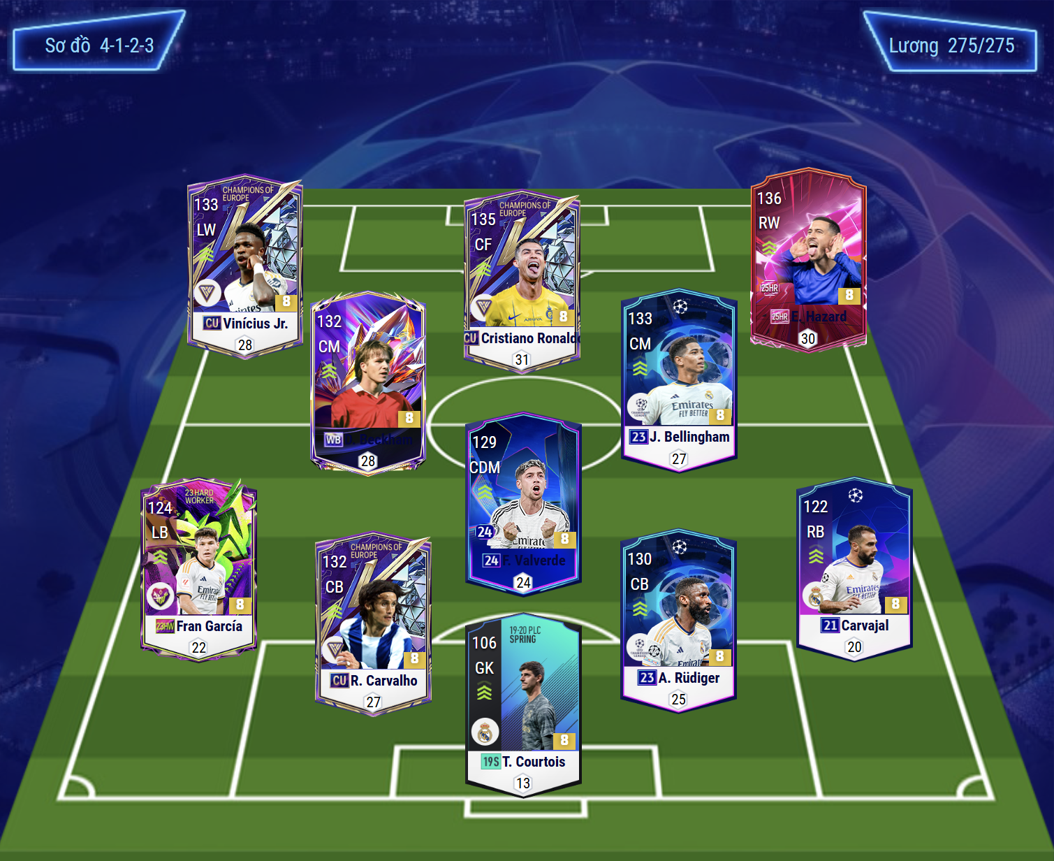 Sơ đồ 4123 được lựa chọn là dạng sơ đồ CF với vị trí tiền đạo cao nhất trên hàng công là Cristiano Ronaldo cho vị trí này. Cặp tiền đạo cánh được tin dùng là Vinicius và Hazard, cả 2 đều sở hữu tốc độ vượt trội, khả năng bám biên rê dắt cũng như chuyền bóng đều rất hiệu quả.