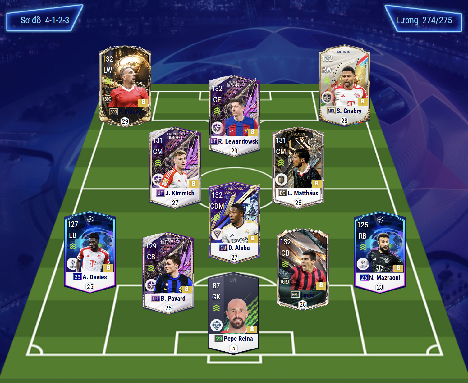 Sơ đồ 4123 CF là dạng sơ đồ mà vị trí tiền đạo cắm ST được kéo lùi về vị trí CF cùng với đó cặp tiền đạo cánh dâng cao hẳn lên để xâm nhập. CF được lựa chọn là Lewandowski, một trong những tiền đạo toàn diện hàng đầu game hiện nay. Cặp tiền đạo cánh LW, RW với 2 cái tên Ribery và Gnabry vừa sở hữu 2 chân 5 sao vừa có khả năng chuyền sút ấn tượng.