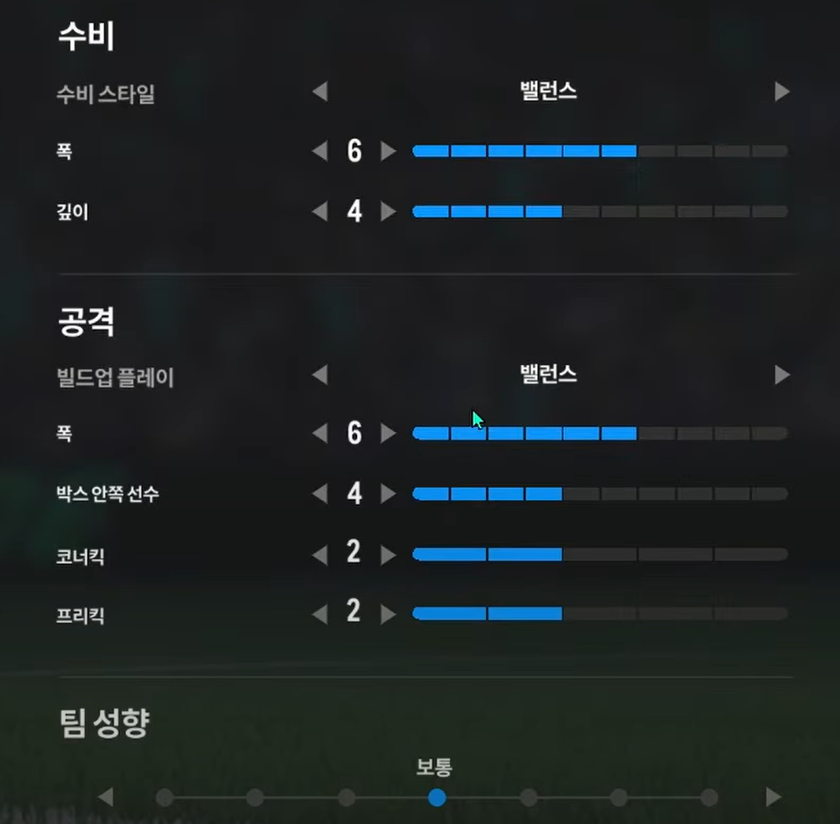Trong khi, thiết lập tấn công "cân bằng" sẽ phù hợp cho lối chơi kiểm soát bóng, triển khai thế trận chậm, chắc ở tuyến giữa và ban bật với các vệ tinh trên hàng công để mở ra khoảng trống và ghi bàn. Ở lối chơi tấn công này, xu hướng triển khai sẽ là xu hướng chậm, chắc bóng và tìm kiếm cơ hội thay vì tấn công tổng lực và tốc độ cao.