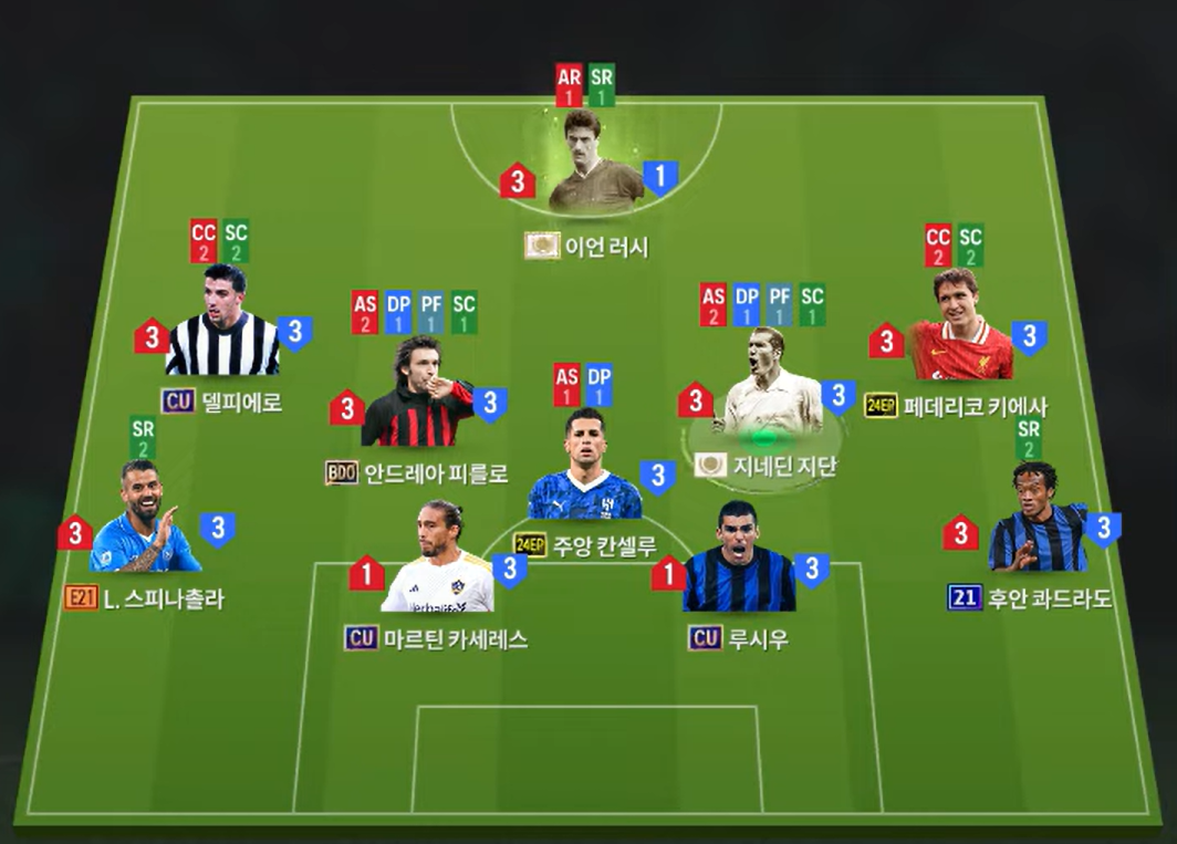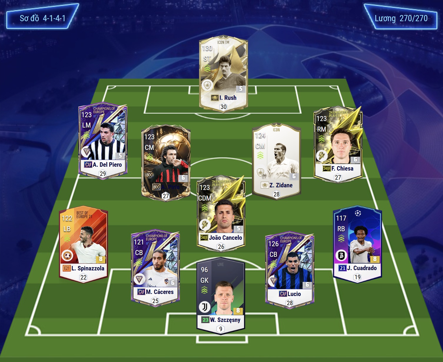Sơ đồ được lựa chọn là sơ đồ 4141 cơ bản với vị trí chơi cao nhất trên hàng công là Ian Rush, một trong những cầu thủ cực kì đa năng. Bộ đôi tiền vệ chạy cánh quốc dân đó chính là Del Piero và Chiesa. Cặp tiền vệ trung tâm đảm bảo tốt khả năng hỗ trợ tấn công chính là Pirlo và Zidane.