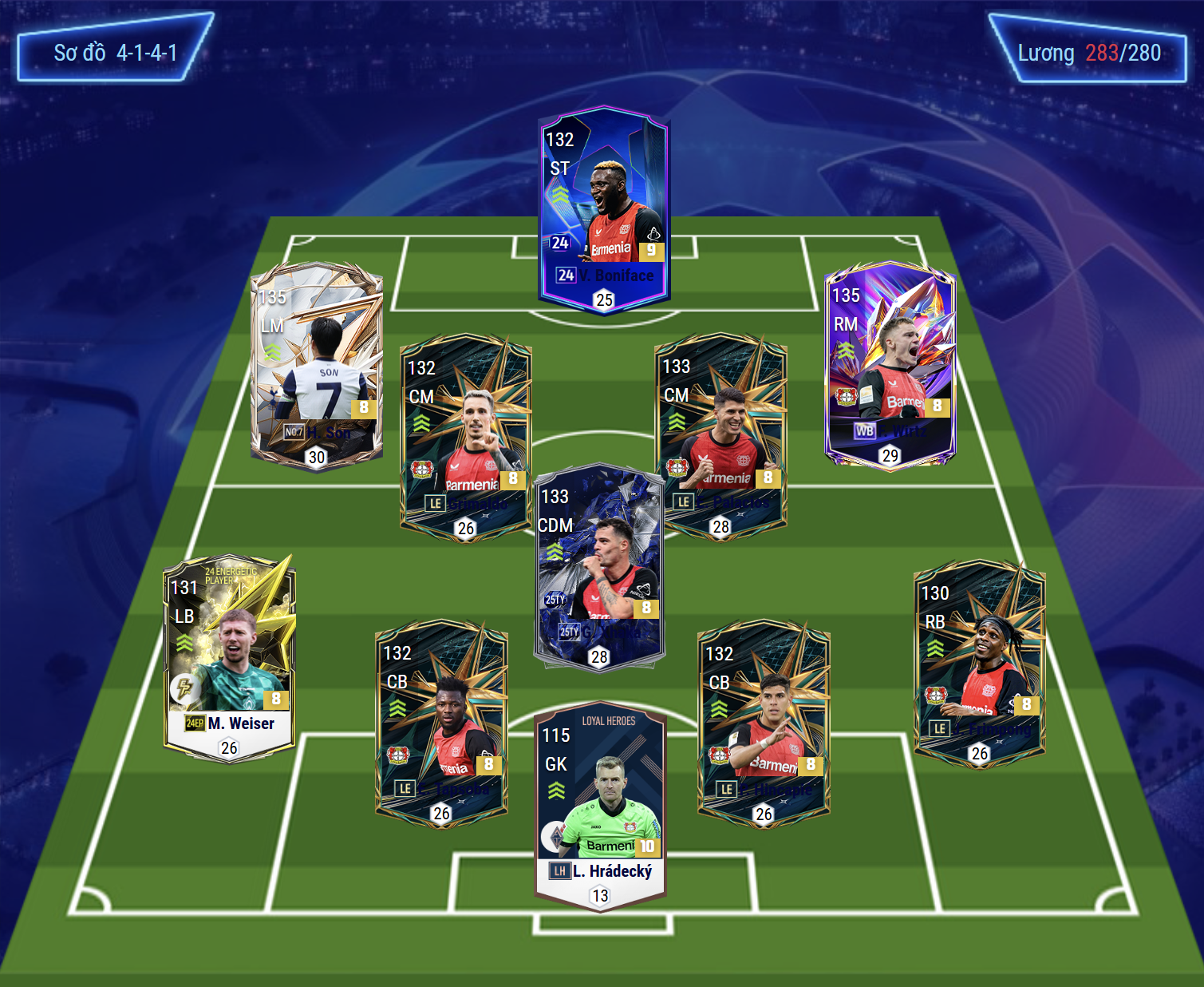 Sơ đồ 4141 được lựa chọn với vị trí tiền đạo cắm là Boniface, một trong những mầu tiền đạo to cao hộ pháp và có khả năng dứt điểm đa dạng hiệu quả. 2 cầu thủ thi đấu ở hành lang cánh lần lượt là Son Heung Min và Wirtz. Cả 2 đều cho thấy hiệu quả ở khả năng dứt điểm chuyền tạt bóng, rê dắt xử lý cho đến khả năng xâm nhập. Cặp tiền vệ trung tâm Grimaldo và Palacios vừa sở hữu khả năng chuyền bóng, thi đấu lên xuống nổi hỗ trợ bao quát tuyến giữa ấn tượng.