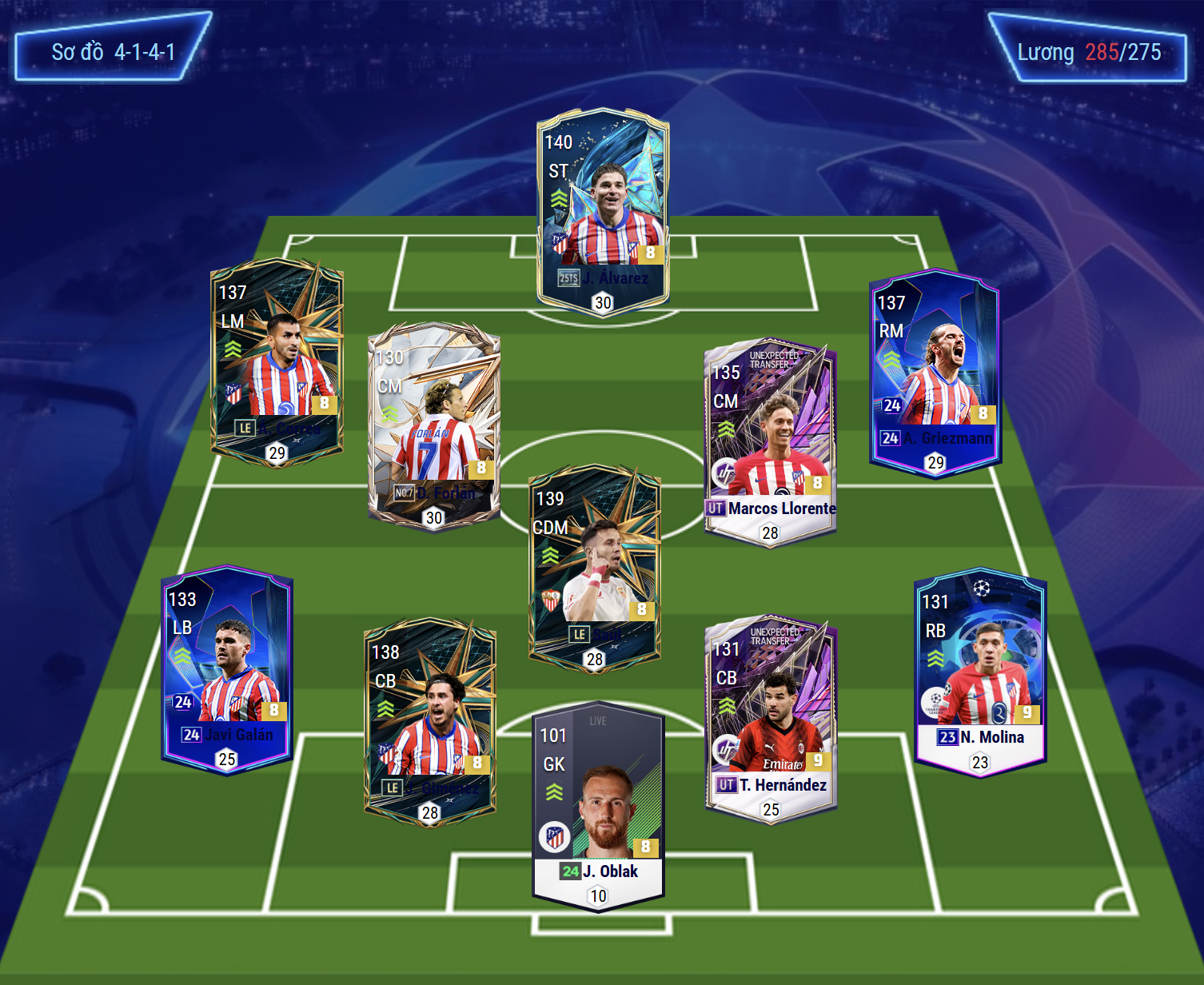 Bộ tứ vệ với Galan và Molina thi đấu hiệu quả ở 2 bên hành lang biên. Thể lực tốt, khả năng lên công về thủ nhịp nhàng chính là những điểm nổi bật để tạo nên hiệu quả vận hành ổn định. Cặp trung vệ Theo Hernandez và Gimenez sở hữu tốc độ và AI phòng ngự khôn sẽ rất hiệu quả cho meta có nhiều cái tên tốc độ như hiện nay. Thủ môn Oblak là lá chắn an tâm hàng đầu trong khung gỗ của Atletico Madrid lúc này.