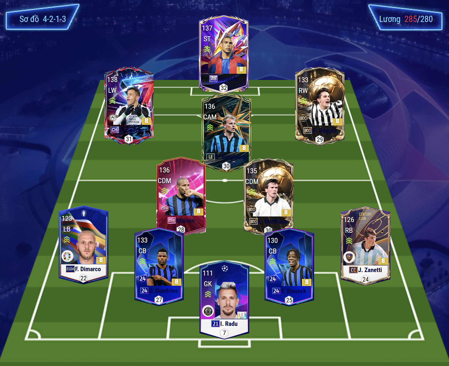 Bộ tứ vệ với Dimarco và Zanetti thi đấu ở 2 bên hành lang cánh, sở hữu tốc độ, khả năng phòng ngự lẫn hỗ trợ tấn công ấn tượng. Cặp trung vệ Dumfries và Bisseck là những cái tên được tin dùng cho meta hiện tại từ tốc độ, AI phòng ngự tắc bóng lẫn không chiến đều nổi bật. Thủ môn Radu là cái tên đáng dùng trong khung gỗ của CLB.