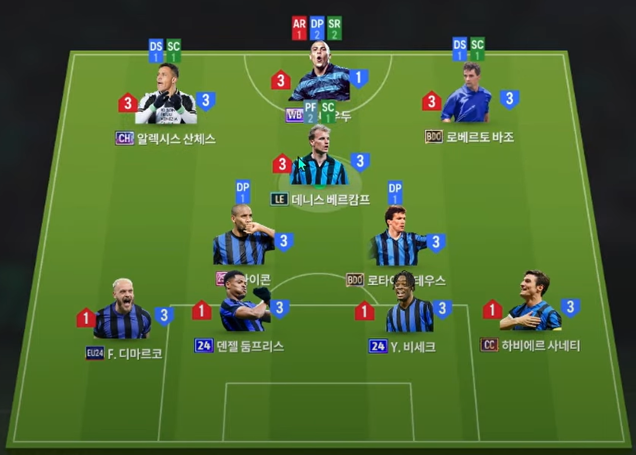 Sơ đồ 4213 được lựa chọn cho team color Inter Milan với vị trí tiền đạo cắm là Ronaldo, đây là cầu thủ khá toàn diện và hiệu quả trong từ tốc độ, khả năng dứt điểm, AI di chuyển đều thông minh. Bộ đôi tiền đạo cánh với Sanchez và Baggio đều là những cái tên sở hữu tốc độ, khả năng chuyền tạt tốt và dứt điểm hiệu quả mỗi khi xâm nhập.