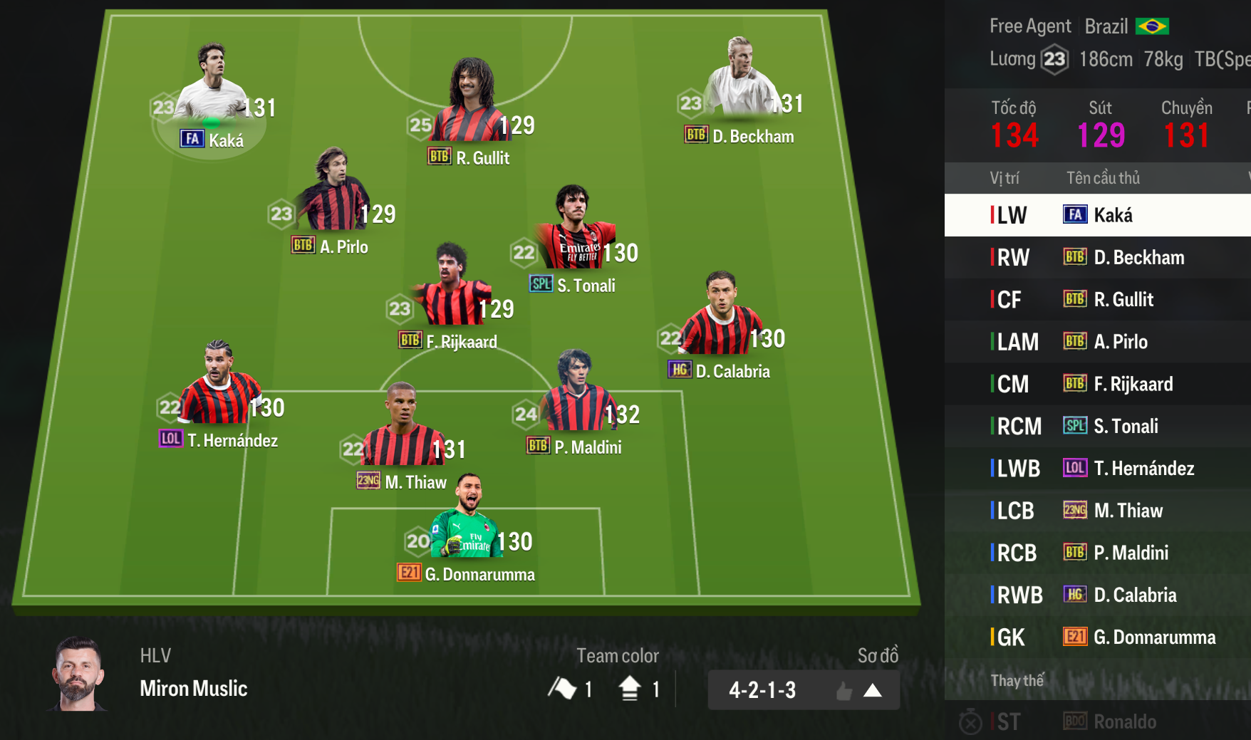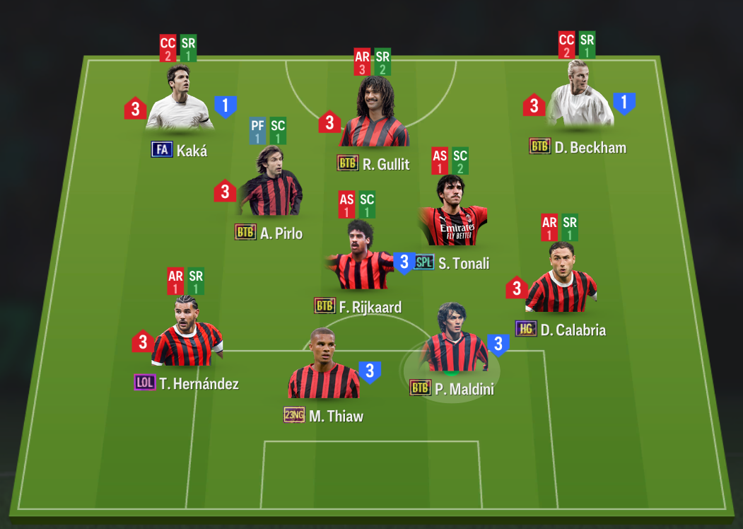Sơ đò 4213 với vị trí CF được lựa chọn là Gullit. 2 tiền đạo cánh Kaka và Beckham sẽ vừa là chân tạt bóng vừa là vệ tinh để các tiền vệ phối hợp đẩy biên để thoát xuống khi cần. Vị trí LAM được lựa chọn là Pirlo, cầu thủ sở hữu kỹ năng sút cũng như chuyền cực kì nổi bật ở rìa ngoài khu vực vòng cấm.