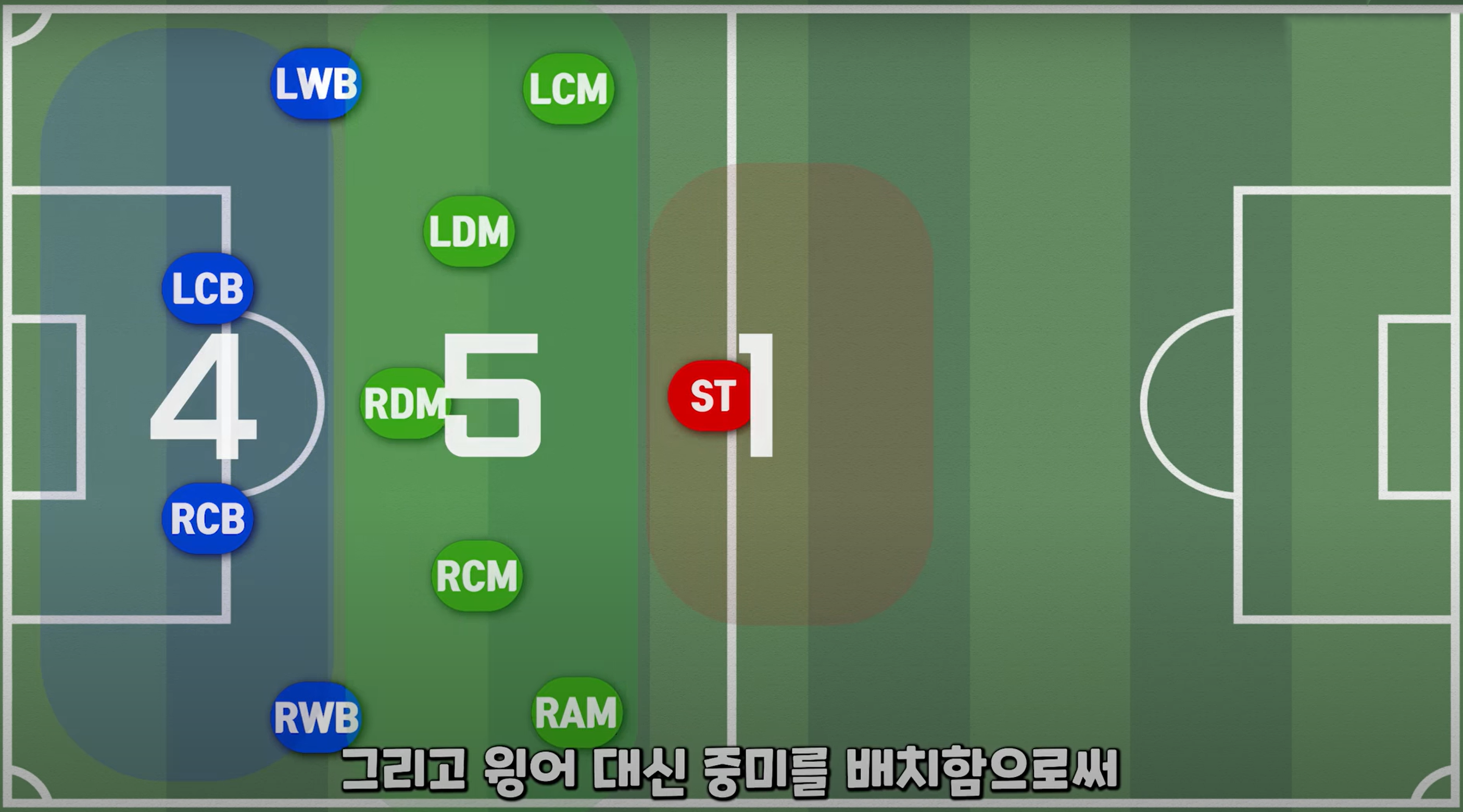 Trong khi đó, mỗi khi phòng ngự, các vị trí sẽ lui về gọn hơn tạo nên thế trận phòng ngự 4-5-1 với 3 tiền vệ giữa sân và 2 vị trí sẽ dạt biên phòng ngự. Điều này tạo ra 2 lớp phòng ngự dày, giúp bảo vệ tốt cả ở hành lang biên để chống tạt bóng cũng như có lượng cầu thủ đông đảo ở vị trí trung lộ nhằm hạn chế lối chơi ban bật trung tuyến cũng như sút xa từ rìa ngoài vòng cấm.