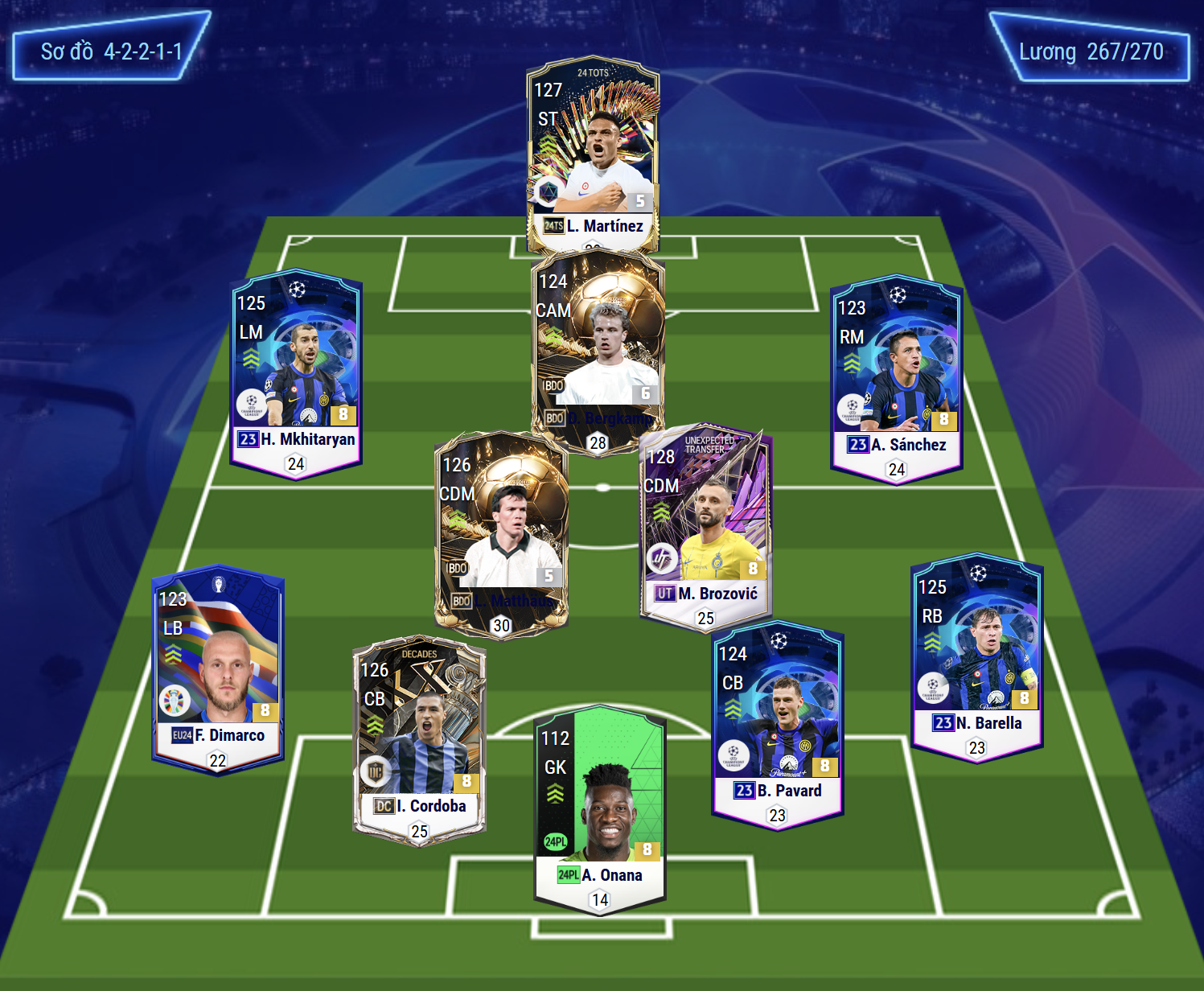 Sơ đồ 42211 với Lautaro Martinez là cái tên chơi cao nhất trên hàng công, đây cũng được xem là tiền đạo cực kì hợp với meta game hiện nay. Hỗ trợ cho anh là Bergkamp ở vị trí tiền vệ công, đây cũng được đánh giá là một cái tên rất tiềm năng hiện tại. Cặp tiền vệ cánh được tin dùng là Mkhitaryan và Sanchez.