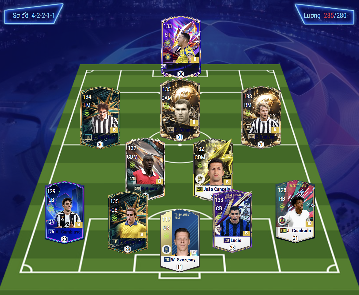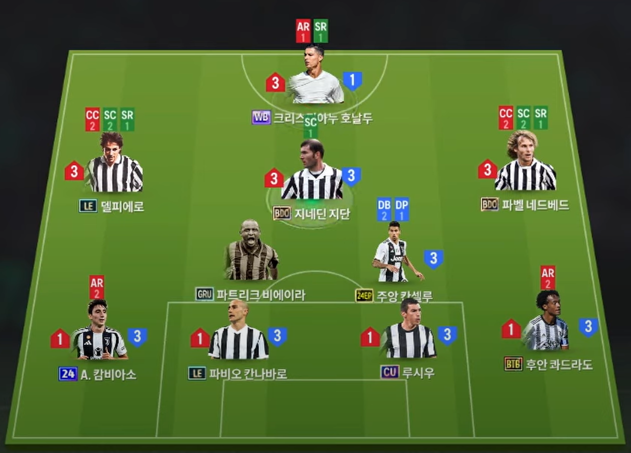 Cặp tiền vệ cánh với Del Piero và Nedved đảm bảo tốt được khả năng chuyền tạt, xâm nhập cho đến sút xa đều vô cùng hiệu quả. 2 tiền vệ phòng ngự Vieira và Cancelo sẽ là những cái tên được tin dùng để đảm bảo tốt khâu hỗ trợ phòng ngự lẫn dâng lên hỗ trợ tấn công. Bộ tứ vệ với Cambiaso cùng Cuadrado hỗ trợ phòng ngự tốt cùng với khả năng tham gia hỗ trợ tấn công ấn tượng. Cặp trung vệ Cannavaro và Lucio sở hữu tốc độ ổn, khả năng bọc lót cho nhau khá tốt cùng bộ kỹ năng phòng ngự cắt bóng đều hiệu quả sẽ bảo vệ tốt khung thành của Szczesny.