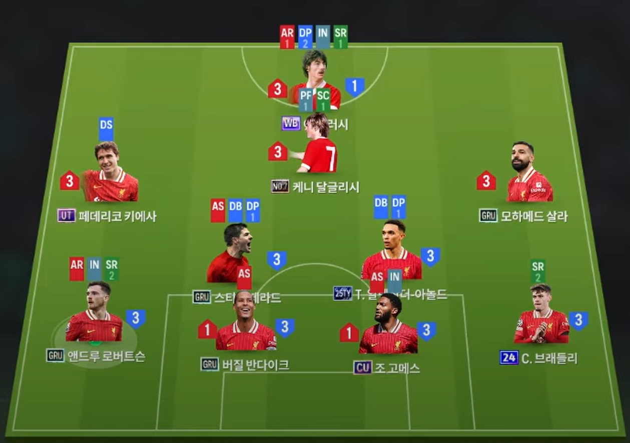 Sơ đồ 42211 được lựa chọn cho Liverpool với vị trí tiền đạo cắm là Ian Rush, một trong những tiền đạo cắm có tốc độ tốt. Tiền vệ tấn công Dalglish là một trong những cái tên khá đa năng và hiệu quả cho team color Liverpool. Cặp tiền vệ cánh Chiesa và Salah là 2 cái tên sáng giá bậc nhất bởi tốc độ tốt, khả năng chuyền tạt ấn tượng cùng kỹ năng sút hiệu quả.