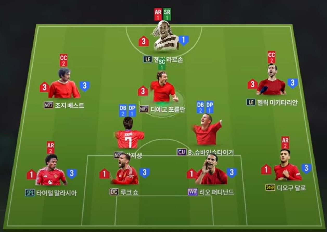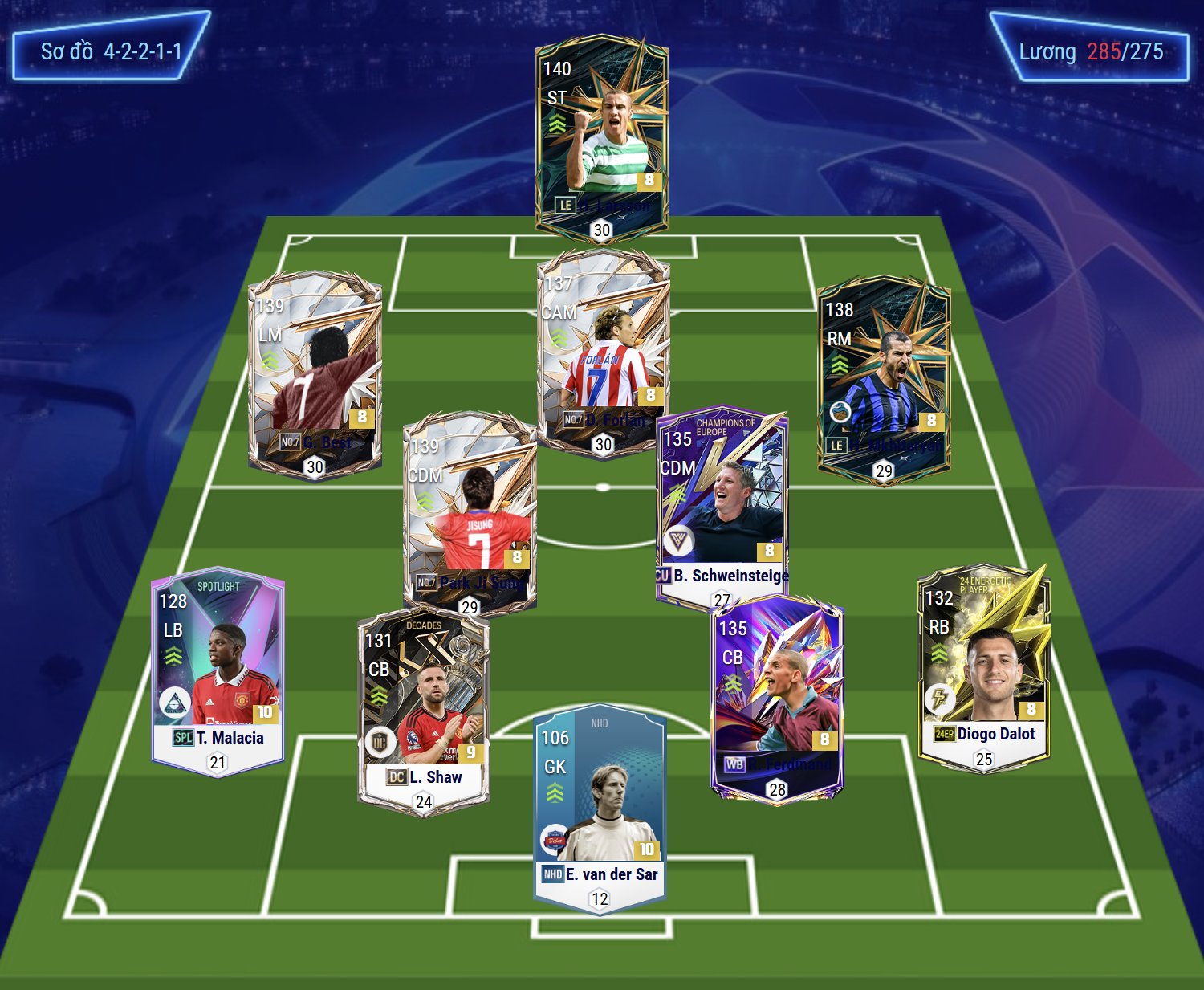 Sơ đồ 42211 được lựa chọn với vị trí chơi cao nhất trên hàng công là Larsson, cầu thủ sở hữu tốc độ, AI di chuyển thông minh và khả năng dứt điểm ấn tượng. Hộ công cho anh là Forlan mùa thẻ NO.7 +8, đây là cầu thủ cực kì toàn diện và phù hợp ở meta này cho vị trí tiền vệ tấn công từ sút xa, chuyền bóng hỗ trợ, AI di chuyển đều ấn tượng.