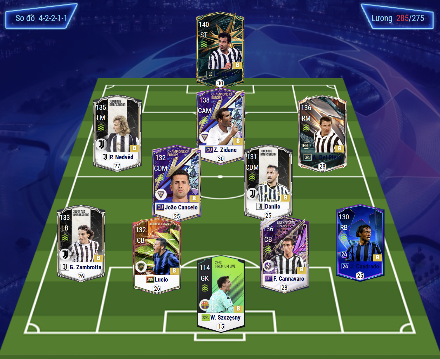 Sơ đồ 42211 được lựa chọn với vị trí tiền đạo cắm được tin dùng là Vialli, cầu thủ có khả năng ghi bàn nhạy bén cùng AI rất hợp meta hiện tại. Hỗ trợ phía sau là vị trí tiền vệ tấn công Zidane, một trong những cầu thủ quốc dân cho vị trí này từ chuyền bóng, hỗ trợ tấn công, dứt điểm ghi bàn cho tới tốc độ đều ổn. Cặp tiền vệ cánh Nedved và Del Piero cũng là những cái tên toàn diện.