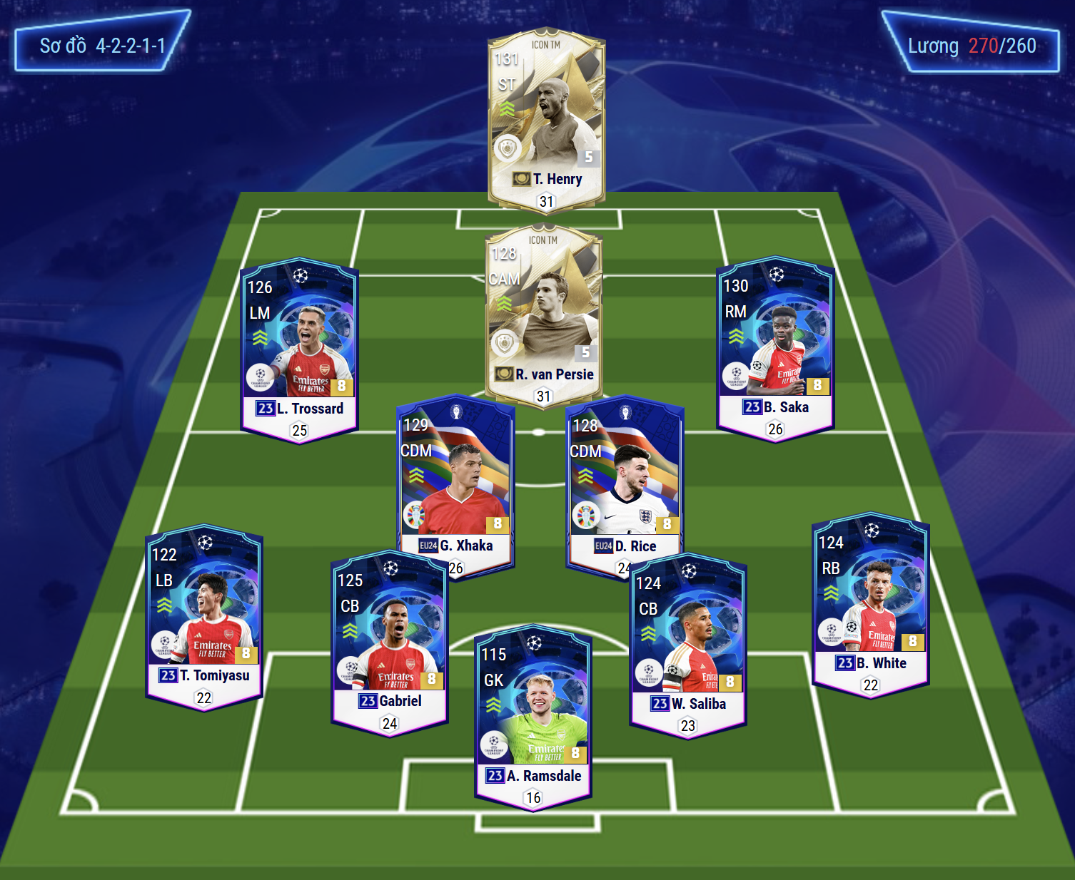 Sơ đồ 42211 cơ bản với Henry sẽ đảm nhiệm vai trò tiền đạo gánh team cho đội hình này. Hỗ trợ cho anh là tiền vệ công Robin van Persie. Cặp đôi tiền vệ cánh cực kì chất lượng ở thời điểm hiện tại là Saka và Trossard.