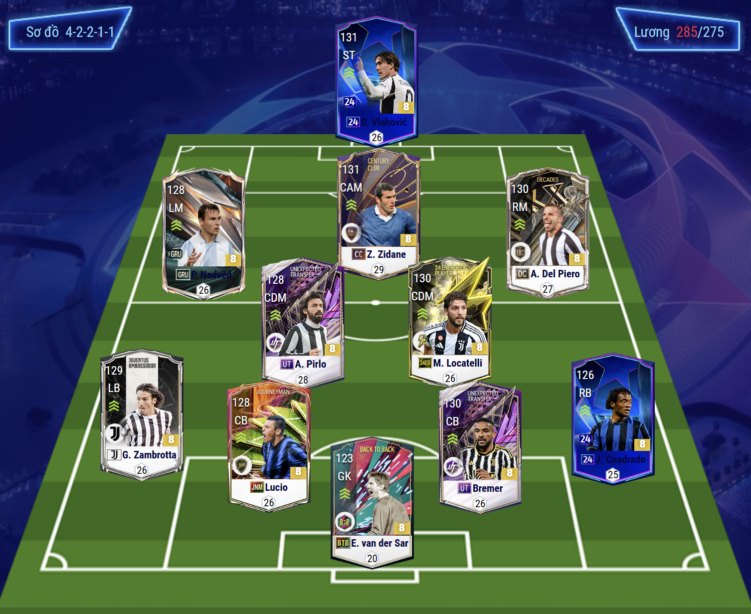 Sơ đồ 42211 hiện đang là dạng sơ đồ được dùng nhiều cũng như hiệu quả trong rank tại meta 11. Ở vị trí tiền đạo cắm, Vlahovic là cái tên được tin dùng nhằm tạo ra hiệu quả tấn công đa dạng. Hỗ trợ phía sau là Zidane, một trong những tiền vệ tấn công quốc dân hàng đầu hiện tại sở hữu khả năng chuyền bóng sút bóng cho đến rê bóng đều cực kì ấn tượng.