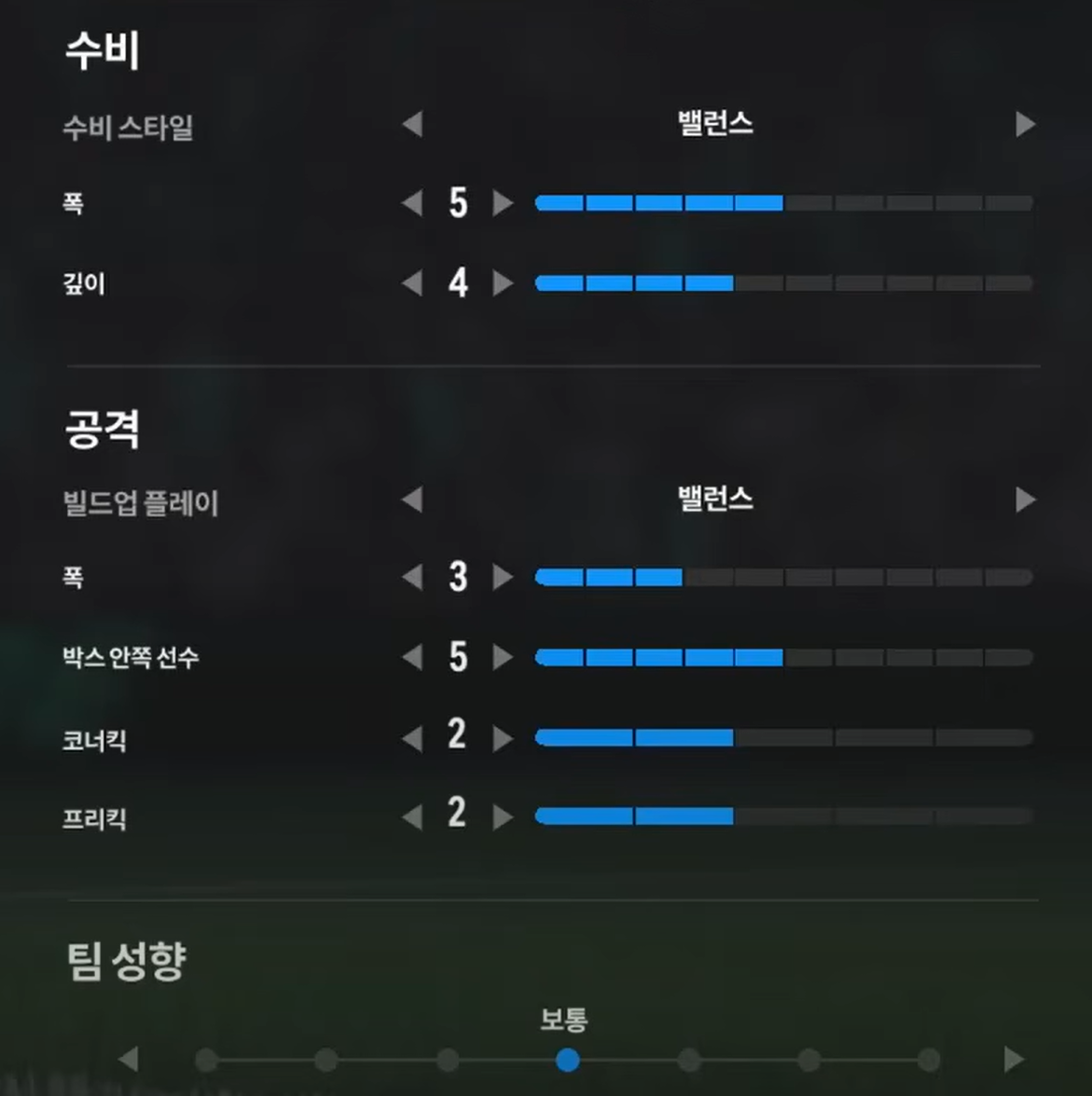 Trong khi, thiết lập tấn công "cân bằng" sẽ phù hợp cho lối chơi kiểm soát bóng, triển khai thế trận chậm, chắc ở tuyến giữa và ban bật với các vệ tinh trên hàng công để mở ra khoảng trống và ghi bàn. Ở lối chơi tấn công này, xu hướng triển khai sẽ là xu hướng chậm, chắc bóng và tìm kiếm cơ hội thay vì tấn công tổng lực và tốc độ cao.