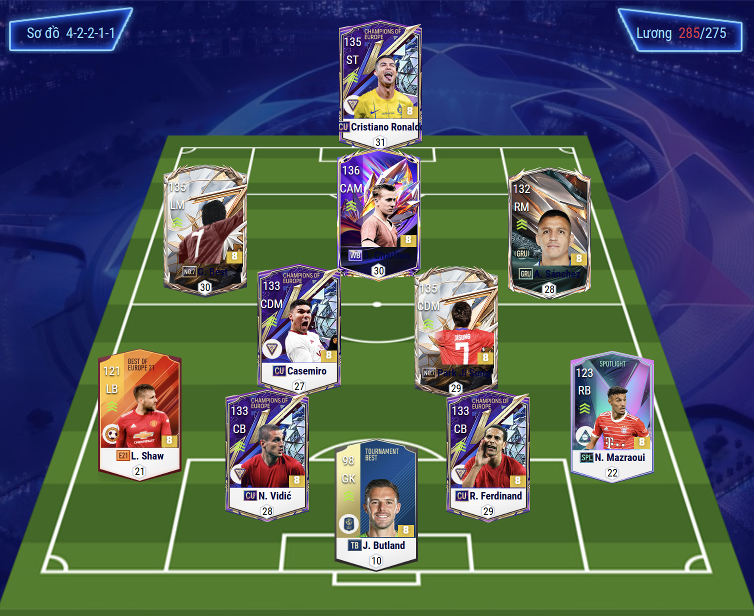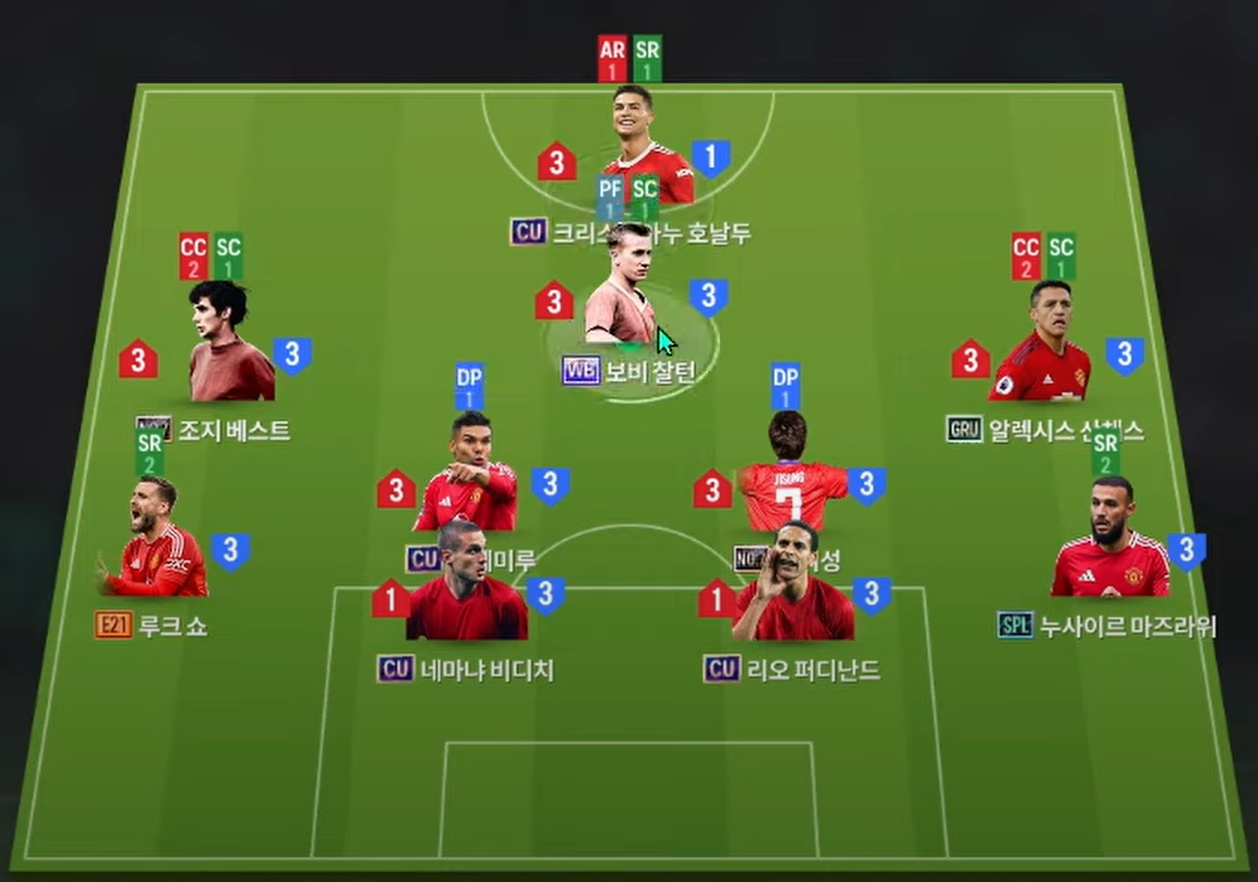 Sơ đồ 42211 được lựa chọn với vị trí tiền đạo cắm là Cristiano Ronaldo, cầu thủ người Bồ khá toàn diện ở khả năng dứt điểm cùng AI di chuyển cực kì thông minh và hiệu quả. Hỗ trợ phía sau là Charlton, một trong những tiền vệ quốc dân của Man Utd khi có thể thi đấu cực kì đa năng và xuất sắc.