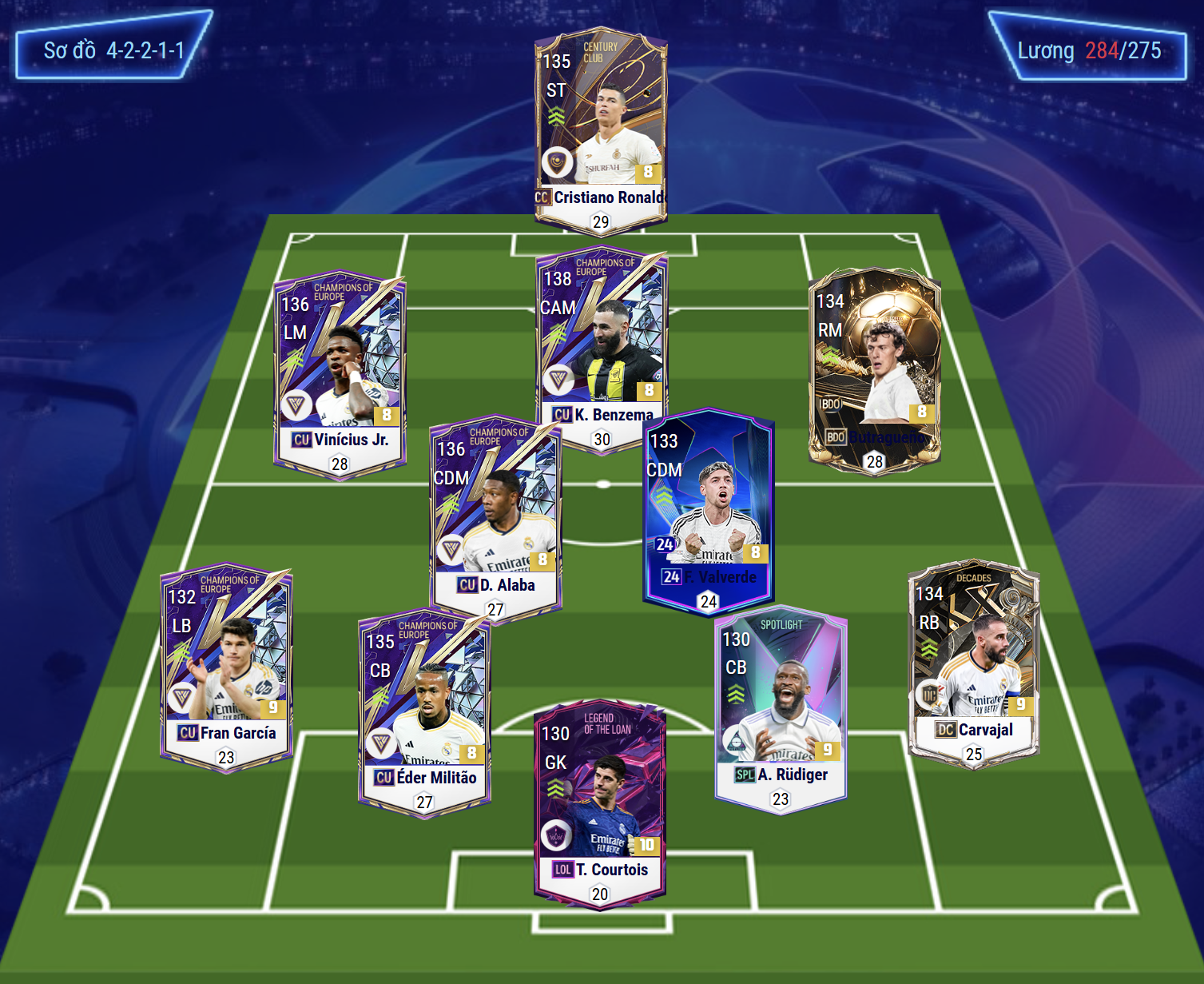 Cặp tiền vệ cánh với Vinicius và Butragueno vừa có tốc độ nhanh nhẹn vừa có khả năng sút chuyền ấn tượng. Điều này sẽ giúp việc leo biên và tấn công ở hành lang cánh càng tối ưu hơn rất nhiều. Cặp tiền vệ phòng ngự với Alaba và Valverde đều là những cái tên toàn diện từ khả năng chuyền bóng, phối hợp tấn công cho lên hỗ trợ phòng ngự.