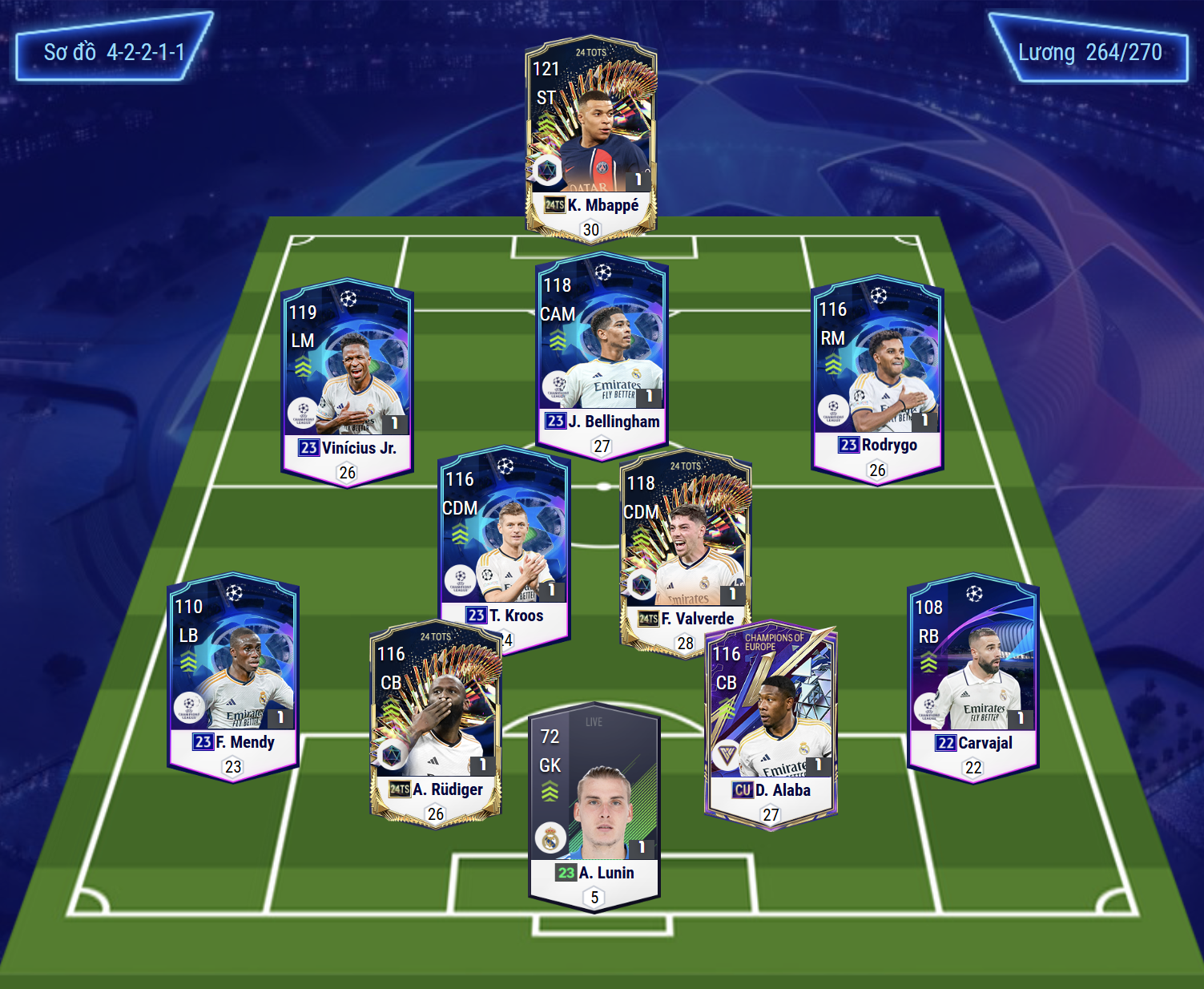 Không chỉ có những cầu thủ huyền thoại đẳng cấp, Real Madrid còn có dàn nhân sự đương đại cực kì nổi bật đặc biệt phù hợp cho sơ đồ 42211. Đây cũng là sơ đồ mà nhiều game thủ sử dụng để leo rank xếp hạng đơn.