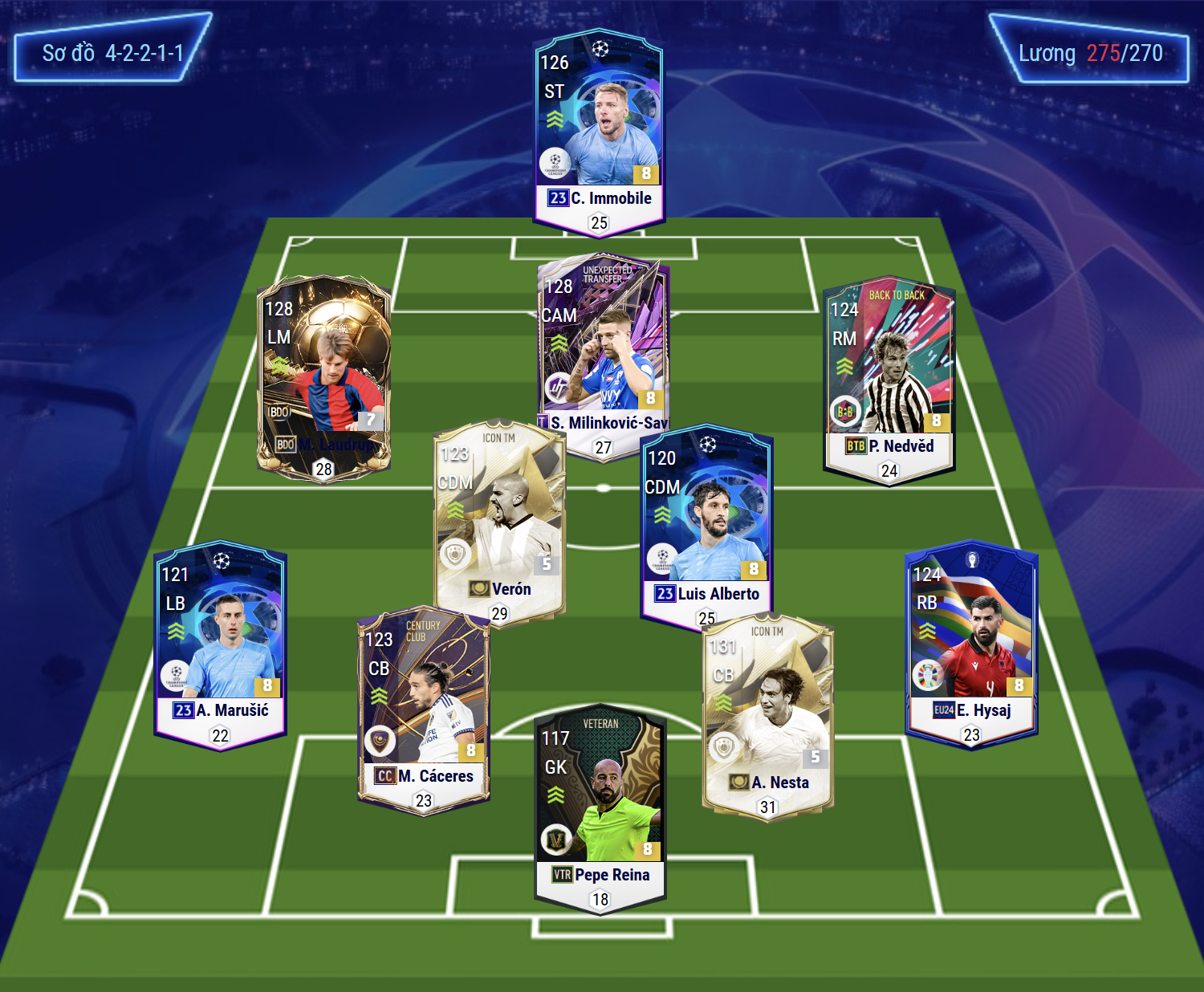 Nếu chỉ nhìn qua cái tên Lazio và lướt qua, sẽ ít người có ấn tượng với đội bóng này cũng như team color này trong FC Online. Tuy nhiên, Lazio lại cũng là một team cực kì mạnh khi đem lại giá trị bất ngờ với những cái tên sáng giá như : Nedved, Laudrup, Veron, Nesta,....
