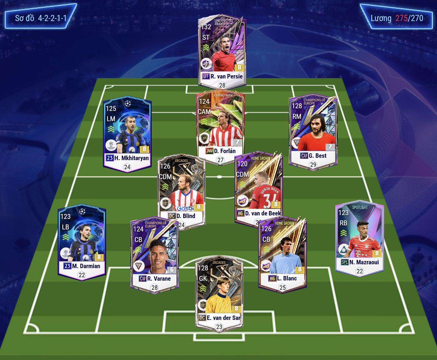 Sơ đồ 42211 với vị trí tiền đạo cắm được lựa chọn là Van Persie, một trong những tiền đạo có khả năng dứt điểm đa dạng. Hộ công cho anh là Forlan, một trong những hộ công quốc dân mà team Man Utd chắc chắn cần có trong đội. Cặp tiền vệ cánh với Mkhitaryan và G.Best đảm bảo tốc độ, kỹ năng chuyền bóng cũng như rê dắt xuất sắc.