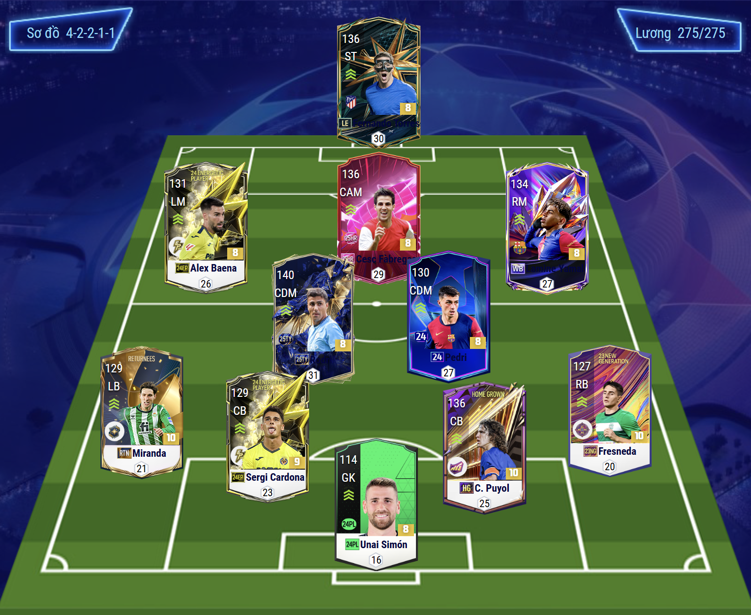 Tiền vệ phòng ngự với Rodri và Pedri đều là những chân chuyền cực kì chất lượng, khả năng hỗ trợ công thủ hiệu quả và bổ trợ cho nhau cực kì ổn định. Bộ tứ vệ với Miranda và Fresneda thi đấu 2 bên hành lang cánh trong khi cặp trung vệ với Cardona và Puyol sẽ là lá chắn thép trước khung thành của Simon.