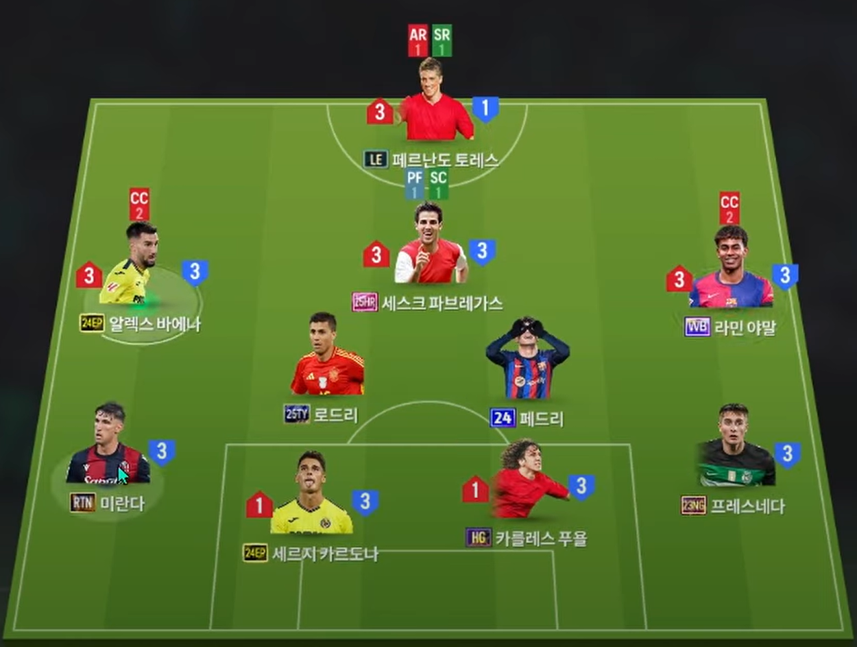 Sơ đồ 42211 với vị trí chơi cao nhất trên hàng công là Torres, một trong những tiền đạo sở hữu tốc độ và sự nhạy bén ở khâu dứt điểm. Hỗ trợ phía sau Torres là Fabregas, một trong những chân chuyền cực kì chất lượng cùng với khả năng sút xa cũng rất uy tín. Cặp tiền vệ cánh với Baena và Yamal sở hữu tốc độ và đảm nhiệm khả năng tấn công xâm nhập và tạo đột biến tốt.