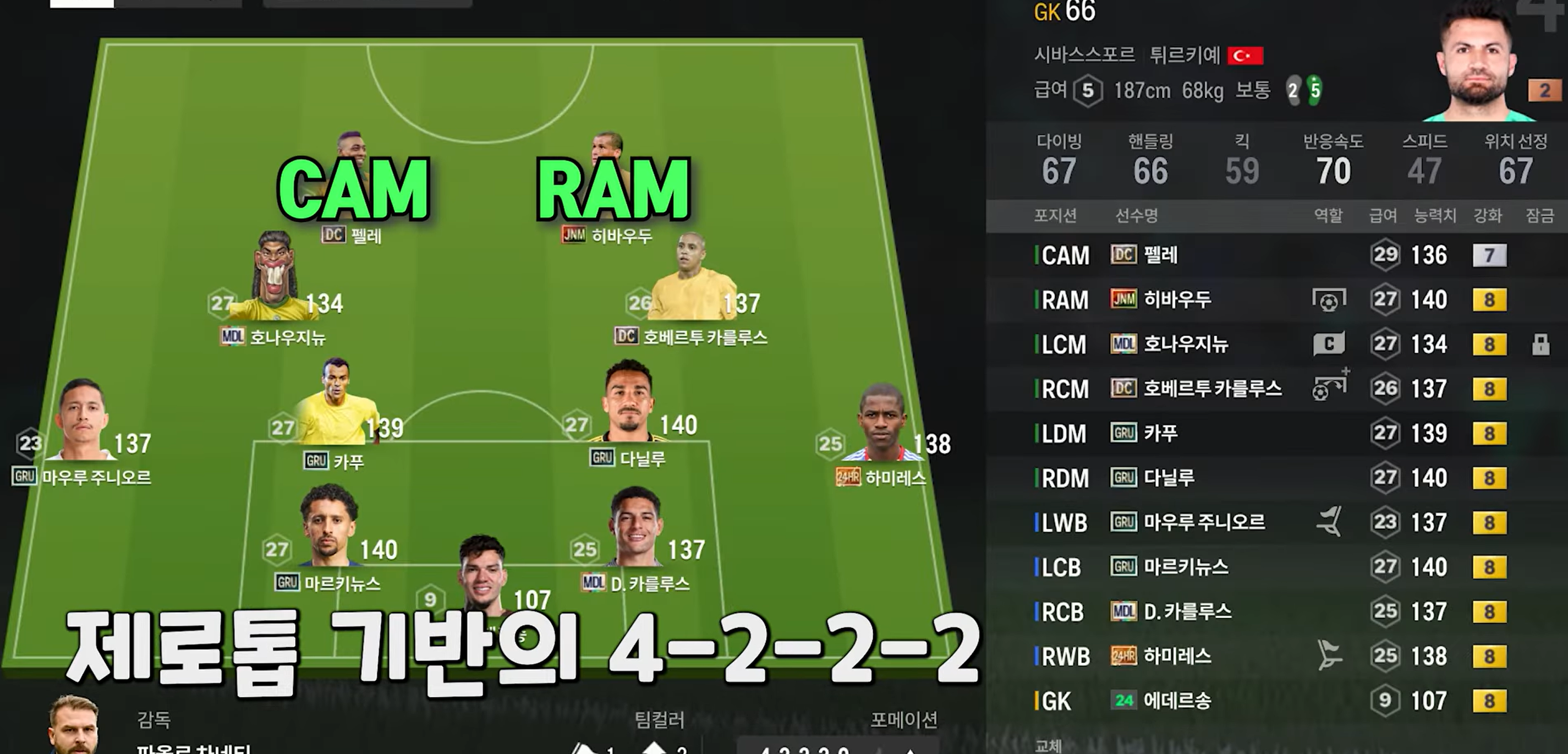 Sơ đồ 4222 không tiền đạo sẽ được thiết lập với nhân tố chơi cao nhất trên hàng công là CAM - Pele. Hỗ trợ cho anh ở phía sau là vị trí RAM được tin dùng bởi Rivaldo. Với dạng thiết lập này, CAM sẽ là nhân tố dâng cao nhất trong khi RAM sẽ thi đấu như một hộ công phía sau, hỗ trợ ban bật để CAM chạy chỗ tìm khoảng trống. Cặp đôi tiền vệ trung tâm LCM, RCM lần lượt là Ronaldinho và Roberto Carlos.