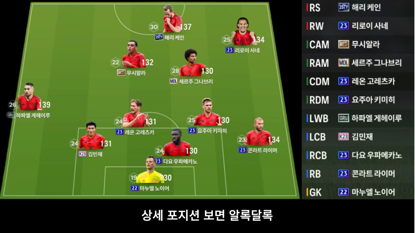 Sơ đồ 4222 với vị trí RS được lựa chọn là Harry Kane, một trong những tiền đạo khá toàn diện cho team Bayern. Vị trí RW với Sane vừa sở hữu tốc độ vừa có khả năng bứt phá rất ổn. Tiền vệ công CAM là Musiala và tiền vệ lệch phải RAM là Gnabry là 2 cái tên có khả năng thi đấu cực kì đa năng, di chuyển thông minh và có tốc độ rất tốt.